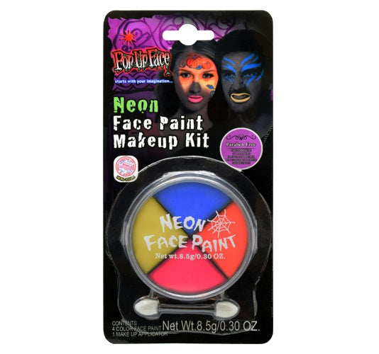 Neon ansiktsfärgkit som lyser upp varje fest! Innehåller starka, lysande färger perfekta för UV-ljus och mörka miljöer. Perfekt för Halloween, maskerad, festivaler och temafester. Enkel att applicera – gör din look extra iögonfallande! Lyser endast i UV-ljus/blacklight.