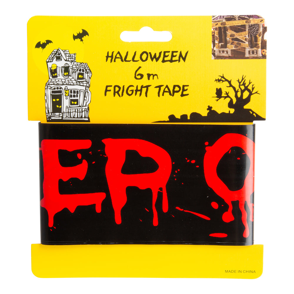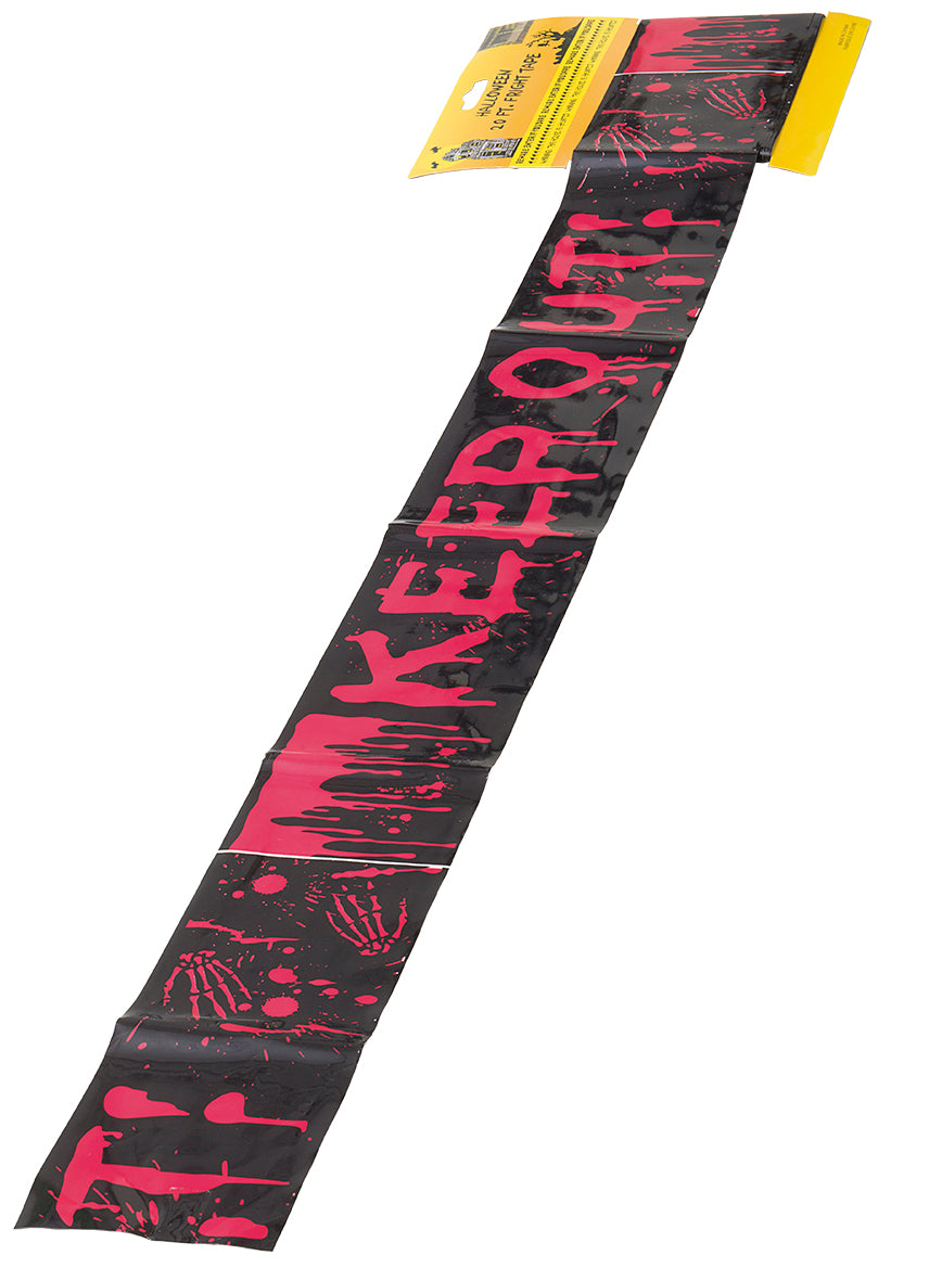 Halloweentejp med texten "KEEP OUT" – tillverkad i plast och perfekt för att skapa en skrämmande avspärrning eller dekorera väggar, dörrar och fönster inför halloween. Enkel att sätta upp för att höja stämningen på festen.