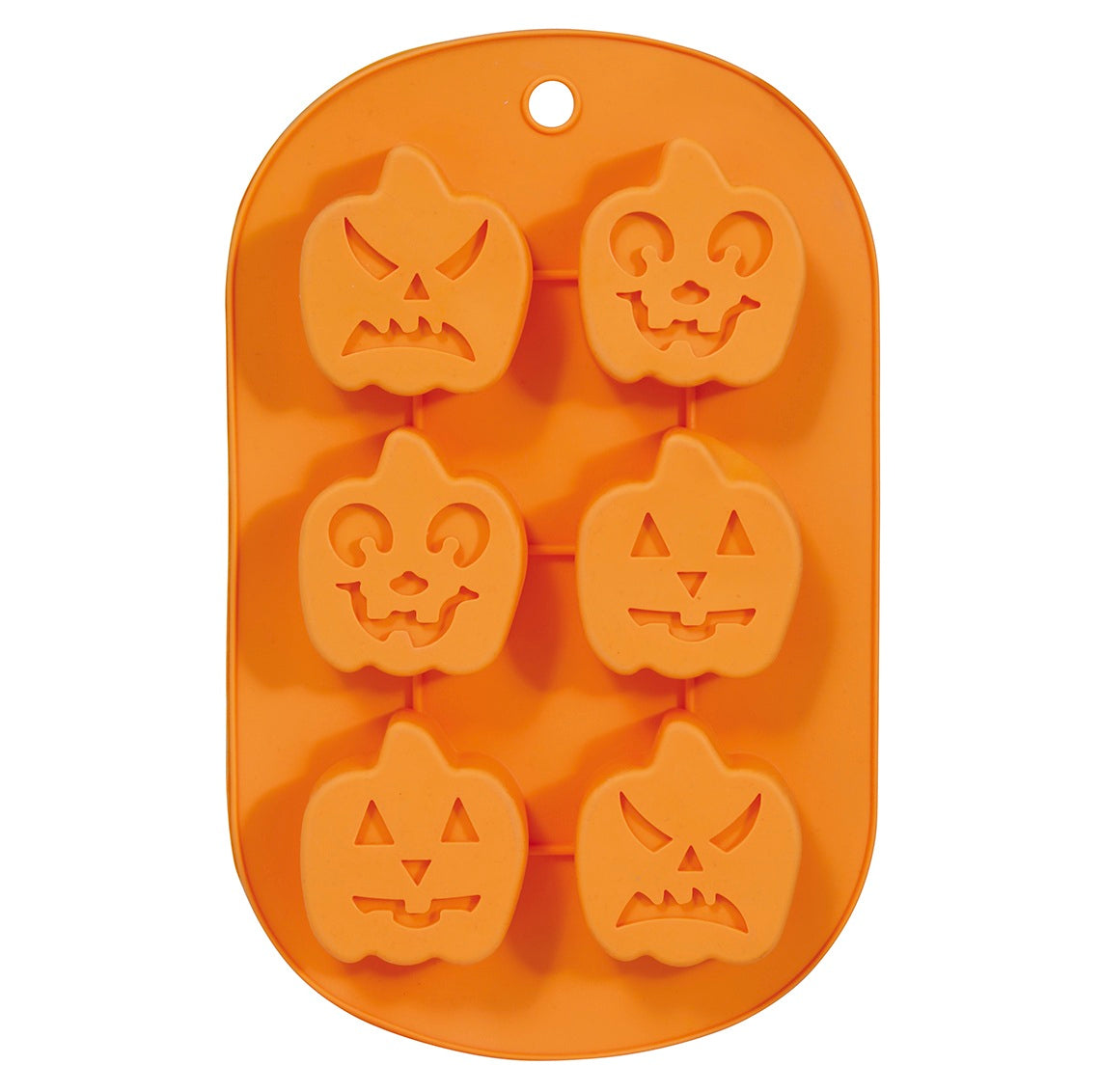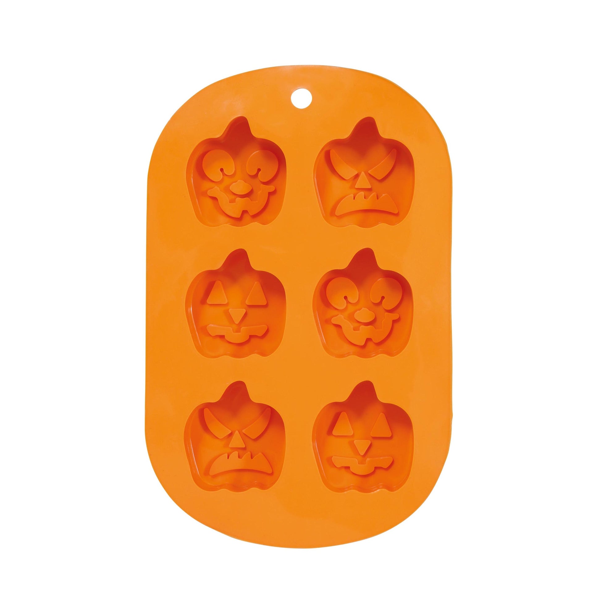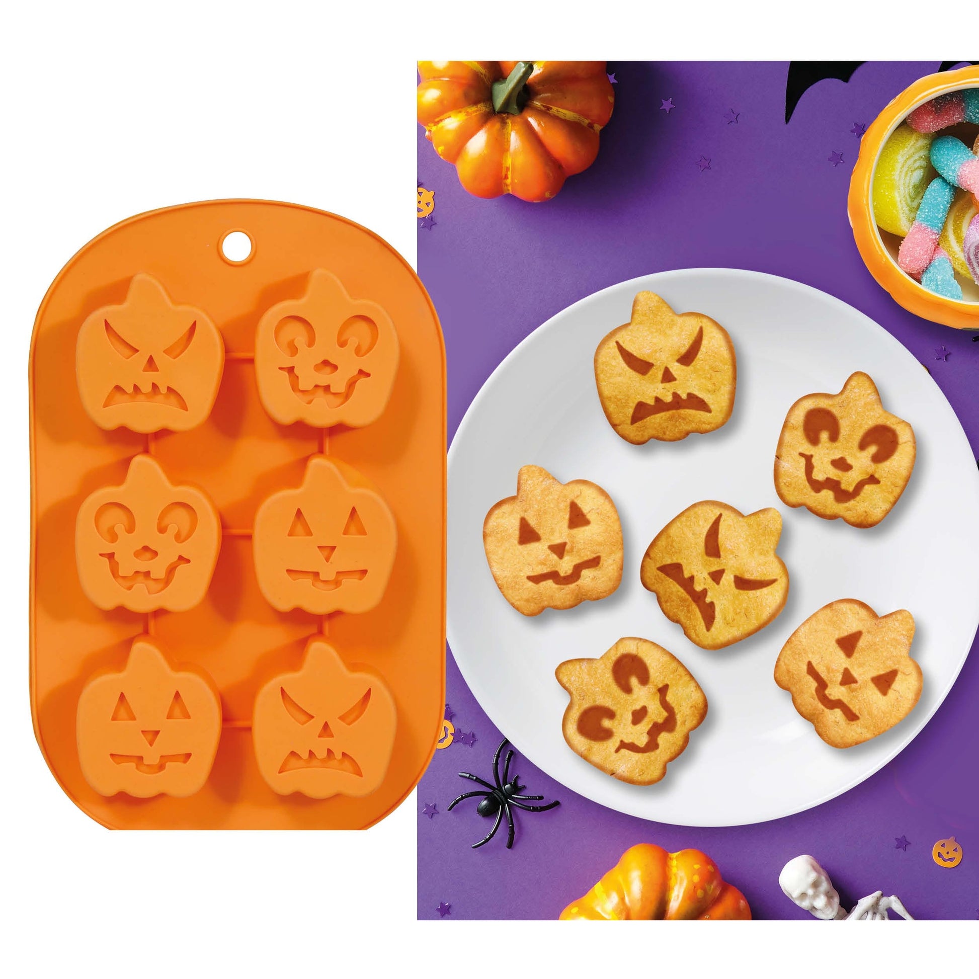 Silikonform för att baka 6 stycken pumpaformade kakor. Varje pumpa mäter ca 6 x 5,5 cm (höjd x bredd), och hela formen är 27 x 17 cm. Perfekt för Halloweenbakning.