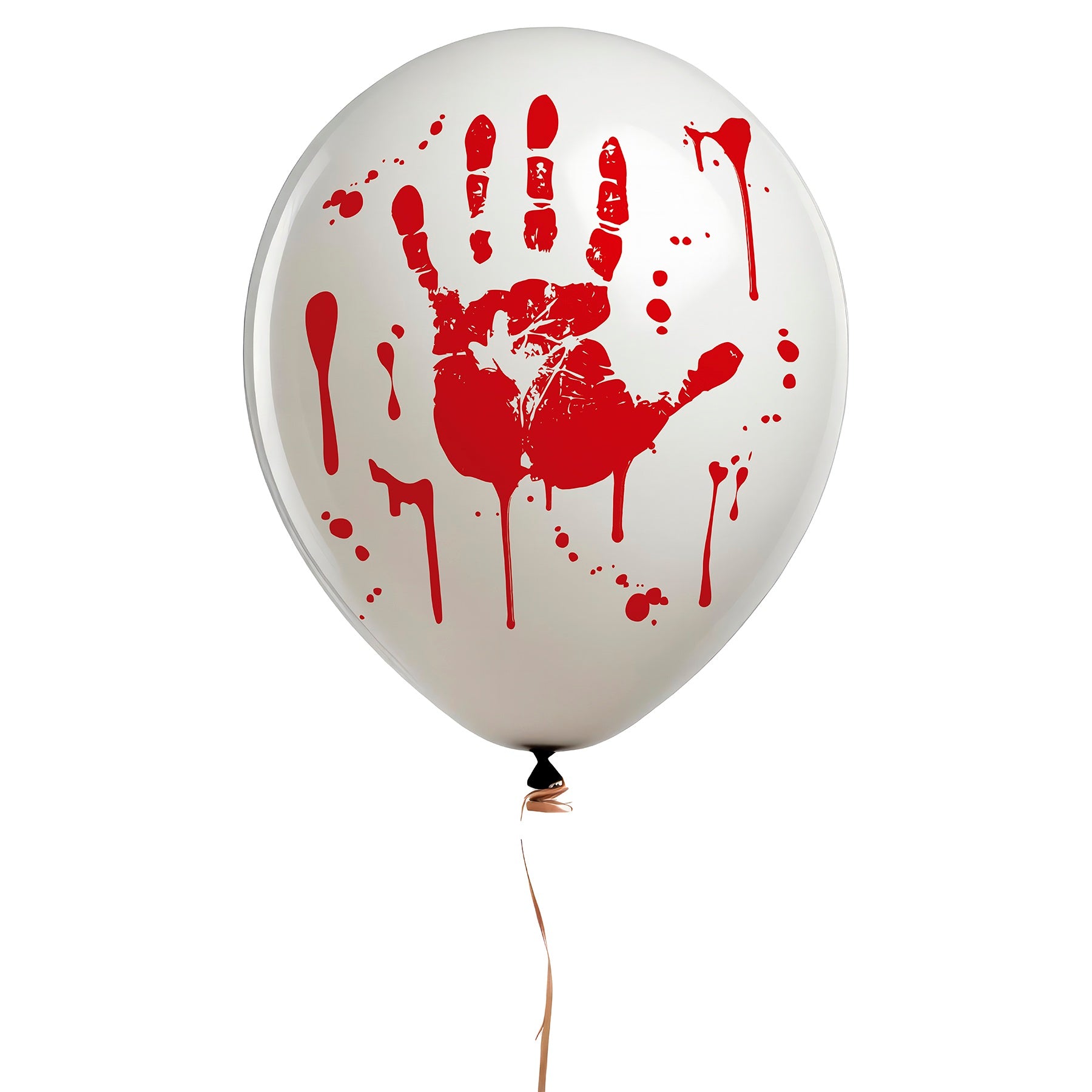 Förpackning med 10 ballonger med blodiga handavtryck – perfekt till Halloween eller skräckfest.