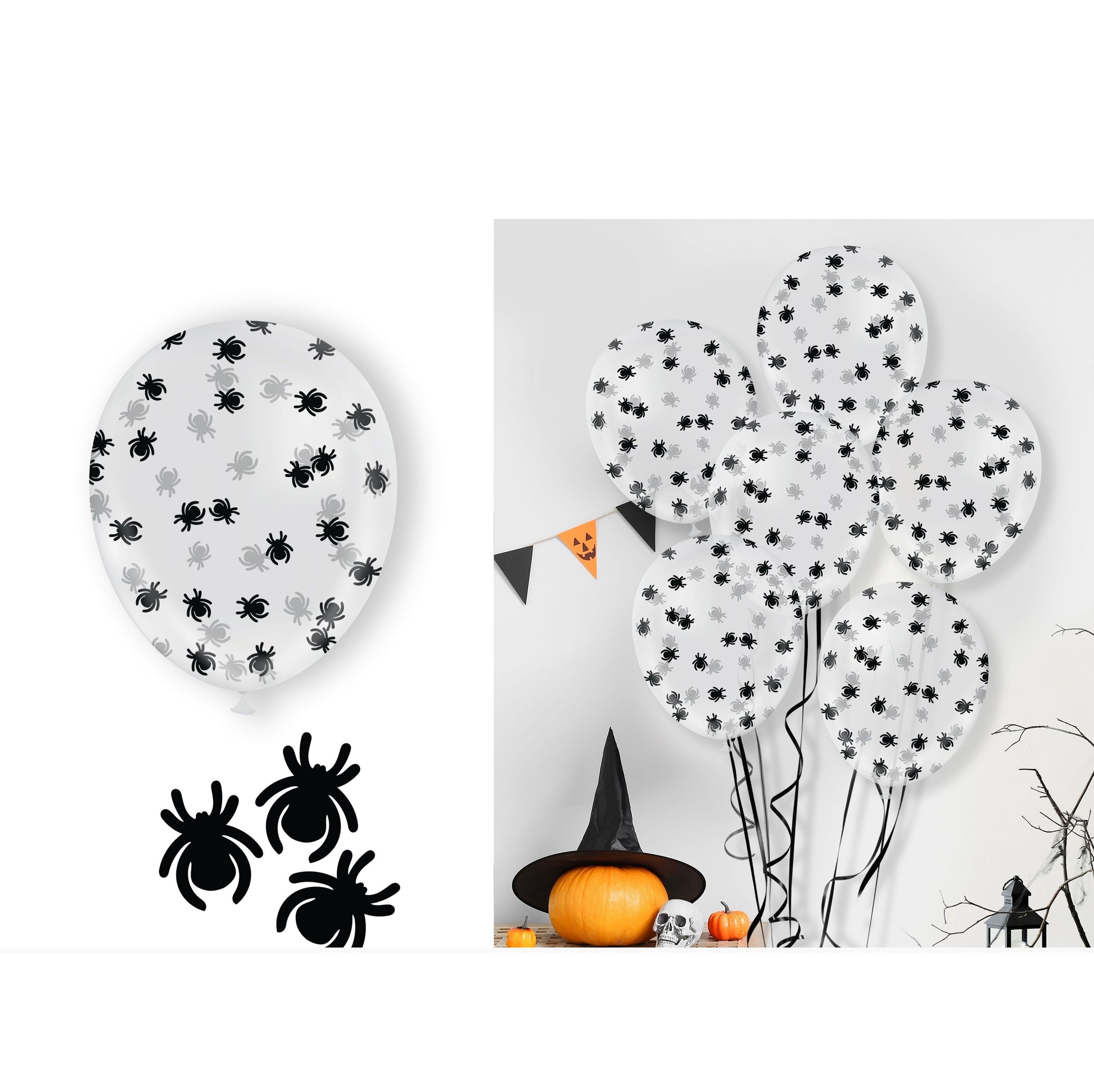 Förpackning med 10 ballonger med spindelmotiv. Perfekta för att dekorera till Halloween, temakalas eller höstfest.