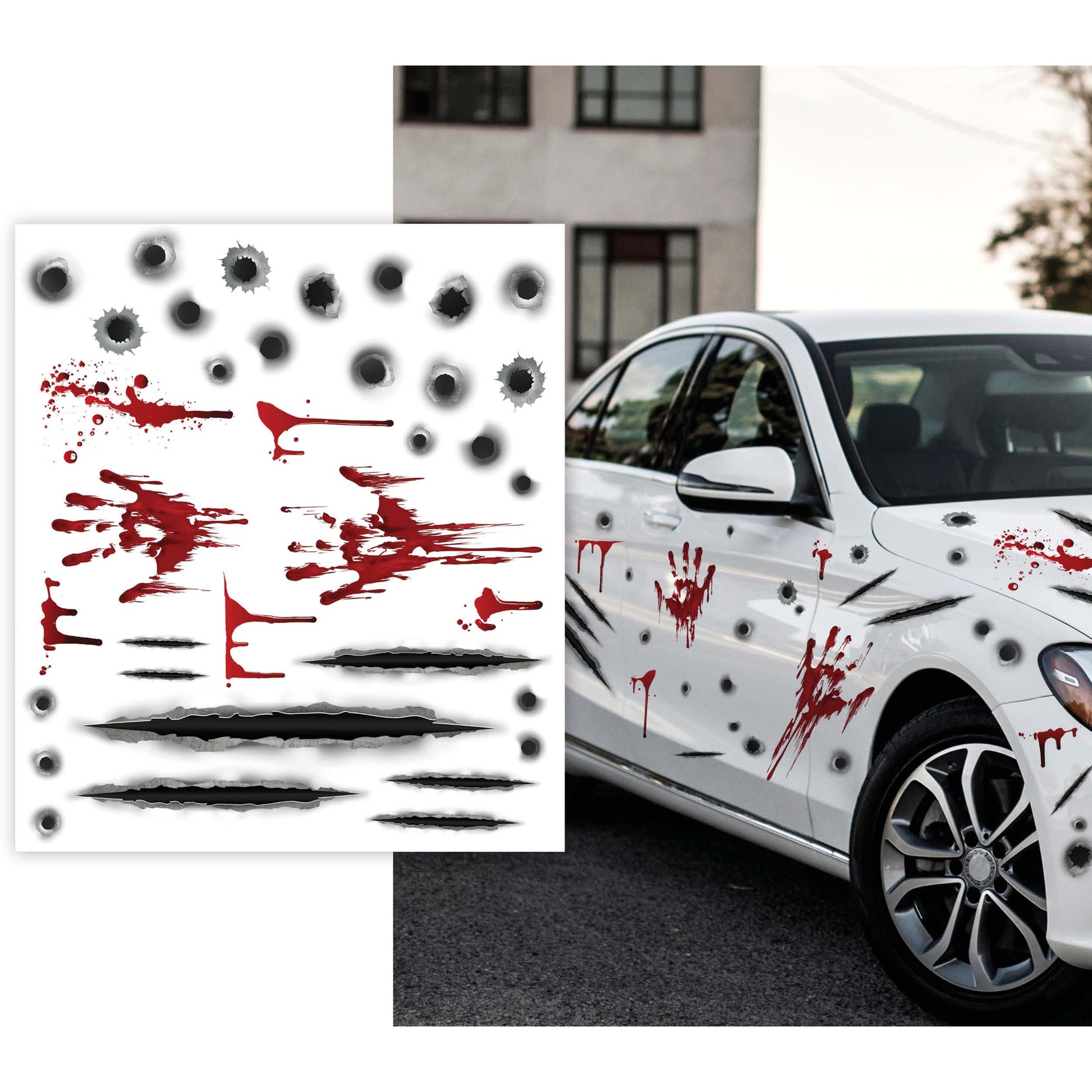 Dekorark med realistiska stickers för bilen – innehåller skotthål, stora rivmärken och blodiga handavtryck. Perfekt för Halloween eller skräcktema.