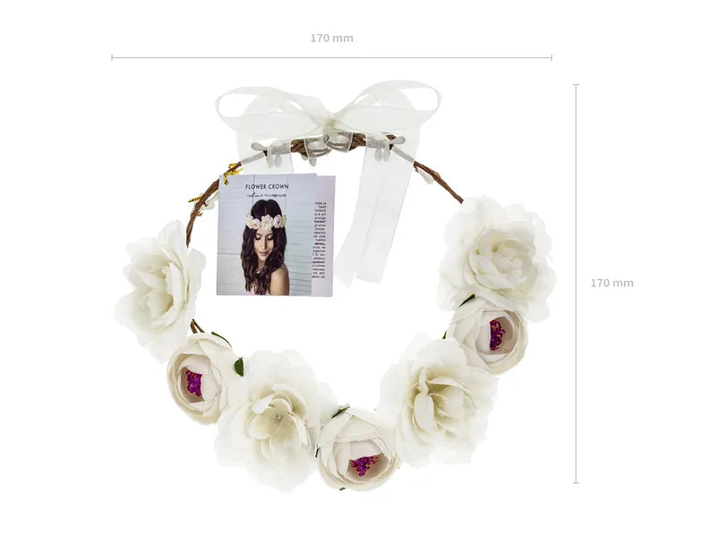 Blomkrona i vitt med en diameter på ca 17 cm. Perfekt som accessoar till maskerad, fest eller utklädnad. Blommorna är ej äkta.