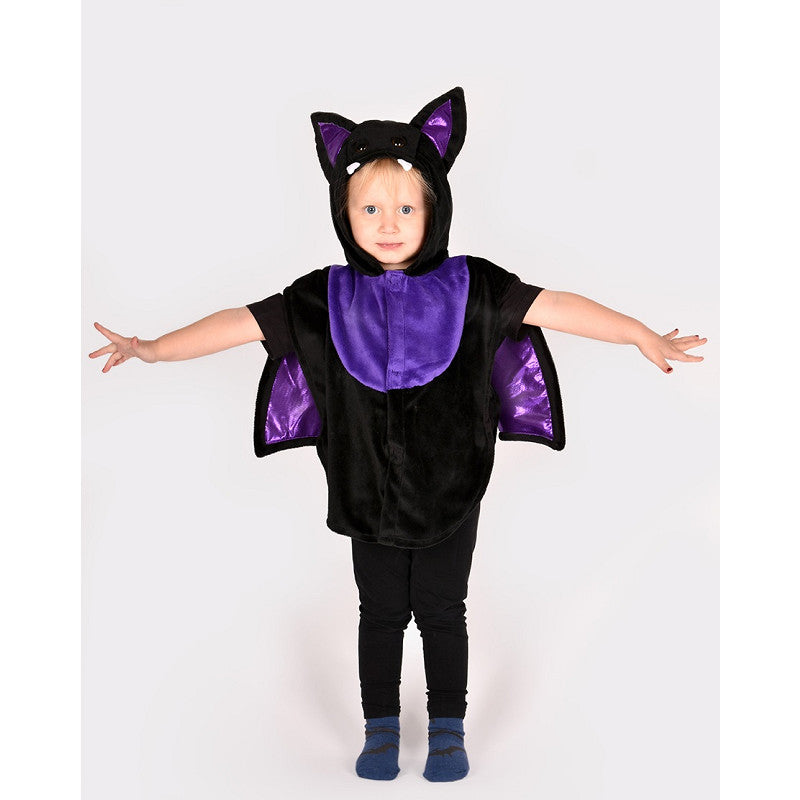 Deluxe mini-cape i form av en fladdermus, i lila och svart. Mjuk och lätt att använda, perfekt för mindre barn som vill klä ut sig. CE-märkt.