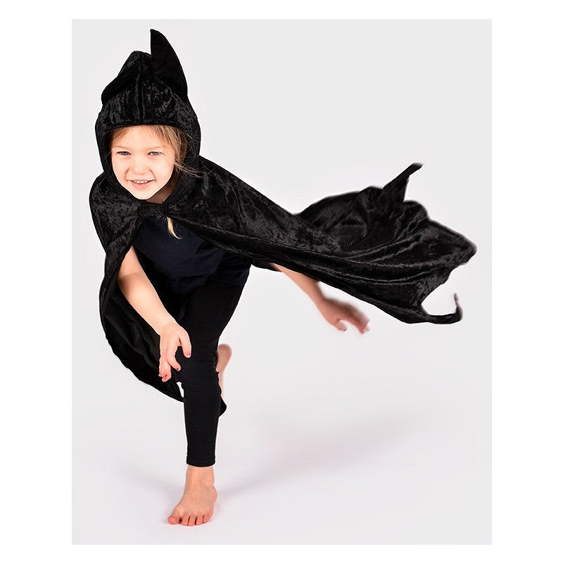 Fladdermuscape i svart sammet med vingar och små öron. Mjuk och bekväm för de yngsta att bära vid lek och utklädnad. CE-märkt.