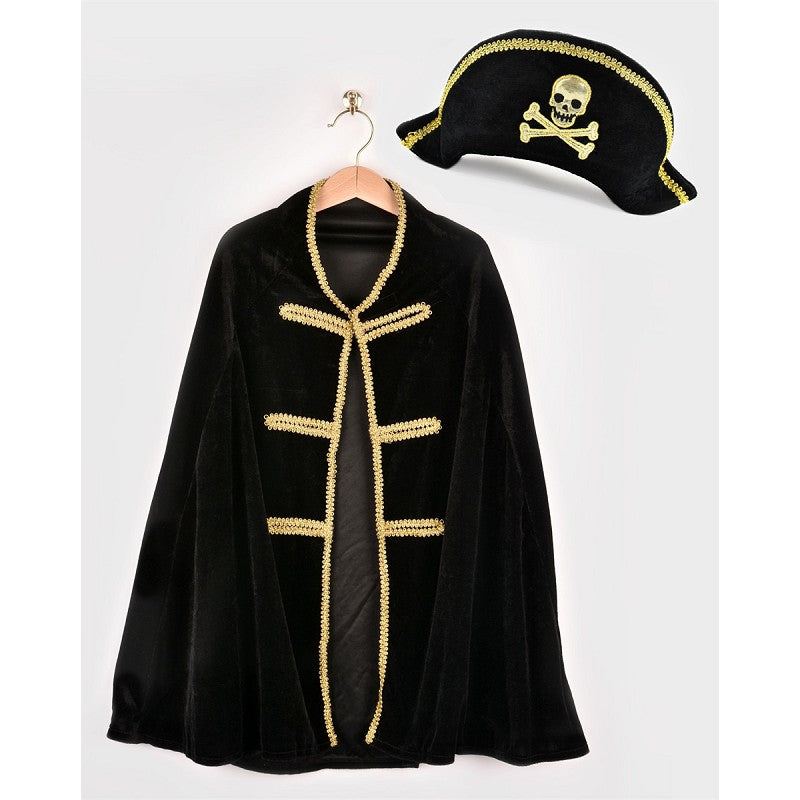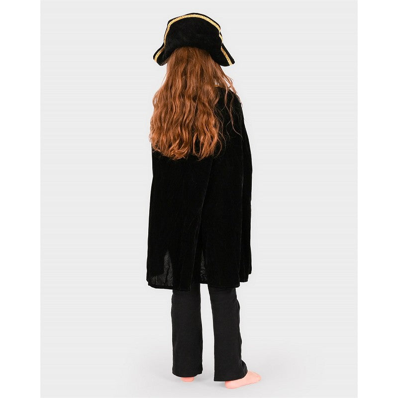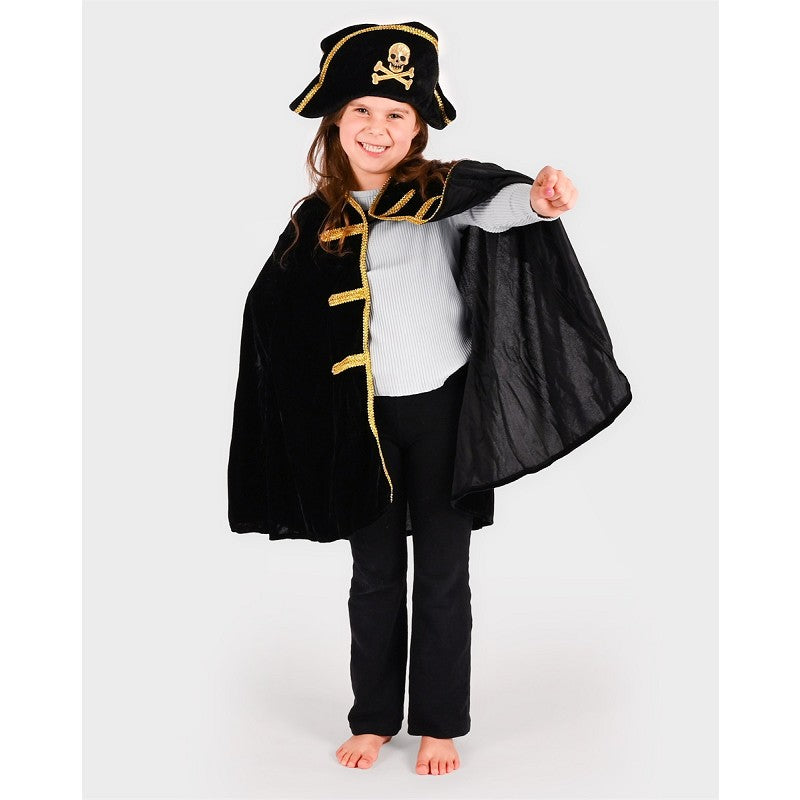 Piratcape med tillhörande hatt, dekorerad med gulddetaljer. Mjuk och bekväm för lek och maskerad. CE-märkt.