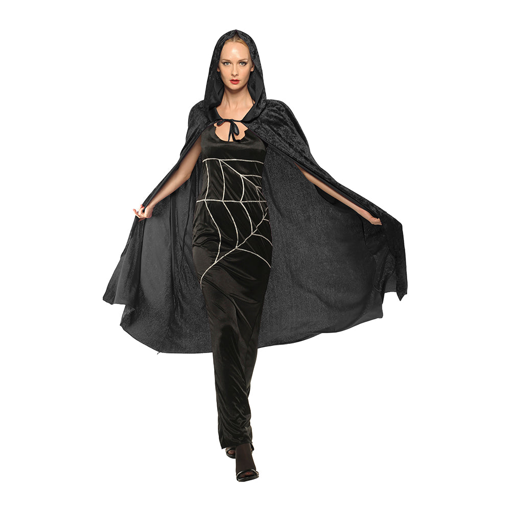 Maskeraddräkt i form av en svart cape med huva. En mångsidig och stämningsfull dräkt för halloween, maskerad eller temafester. Innehåller cape. Tillverkad av 100 % polyester. Storlek: one-size dam (ca 42).