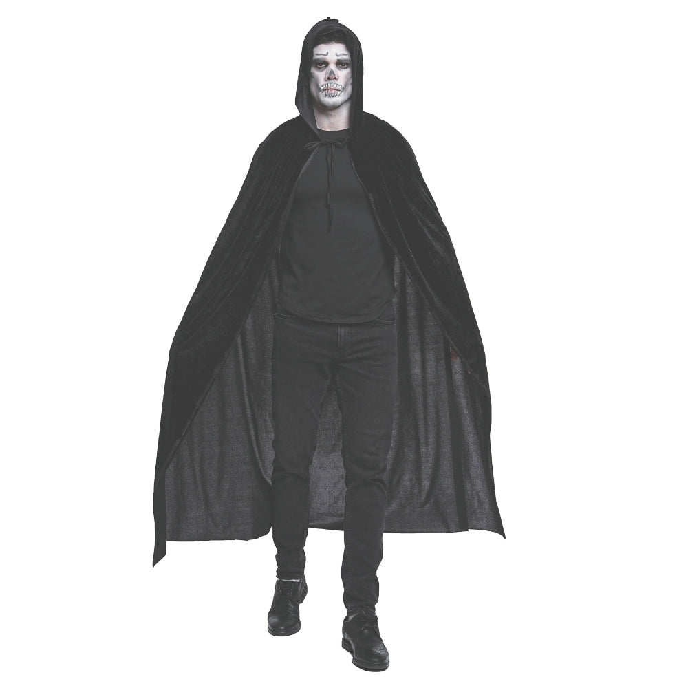 En klassisk svart cape i mjuk sammet med huva – perfekt för att skapa en mystisk och dramatisk look. Passar lika bra till häxor, vampyrer eller andra kusliga karaktärer på halloweenfesten eller maskeraden.