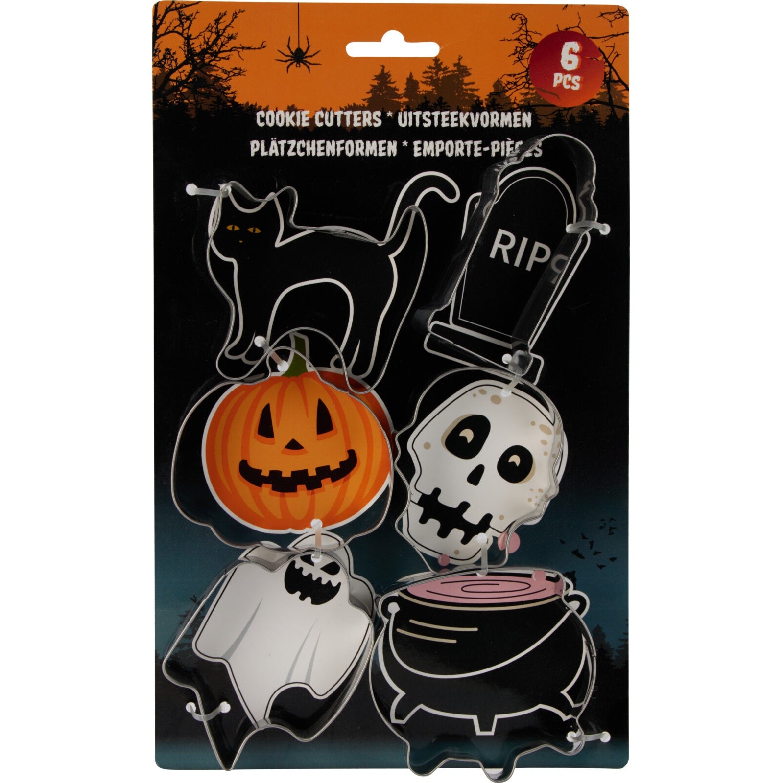 Ett set med sex kakformar i klassiska Halloweenmotiv: katt, gravsten, pumpa, dödskalle, spöke och häxkittel. Perfekt för att baka småkakor, pepparkakor eller till pyssel med sockerpasta och marsipan.