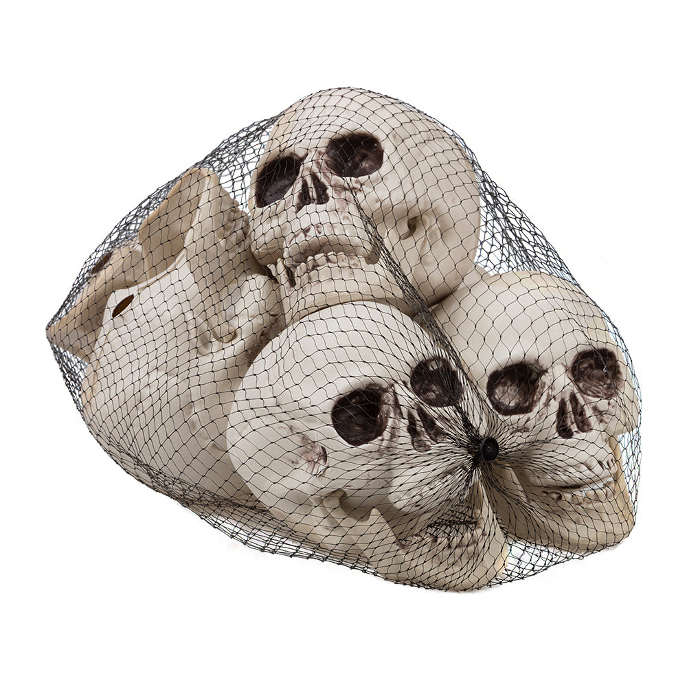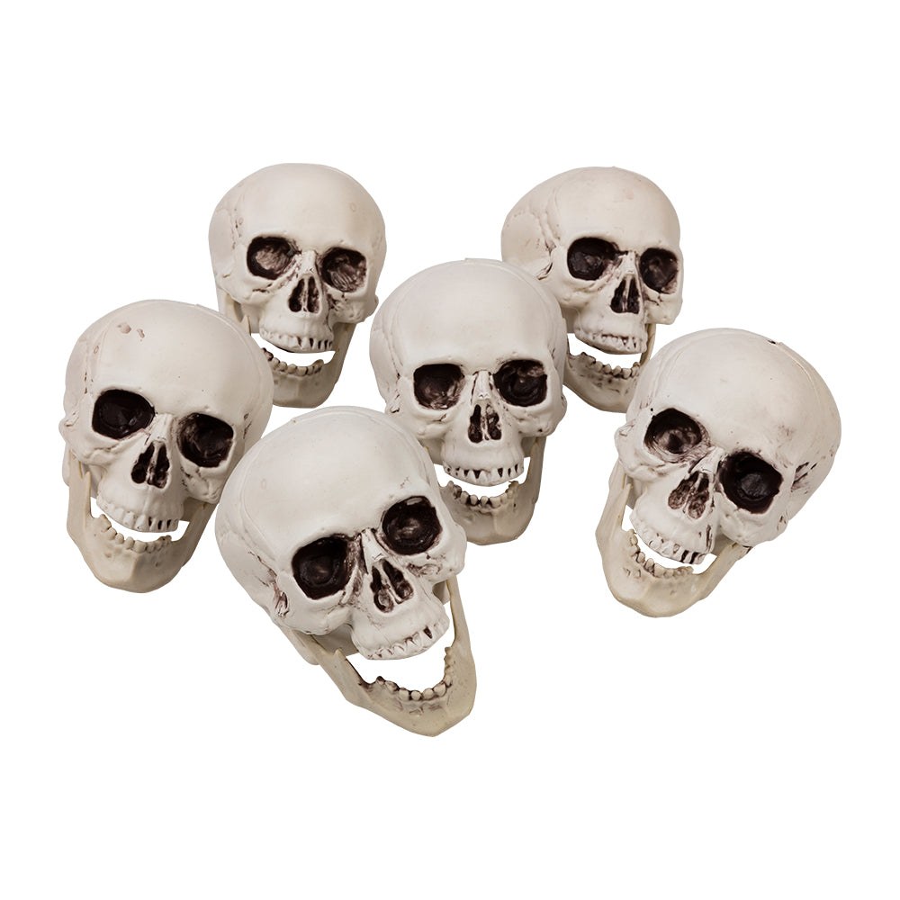 Påse med 6 dödskallar i plast. Perfekta som dekoration till halloween, temafester eller skräckmiljöer. Lätta att placera ut på bord, i fönster eller som del av större dekorscener.