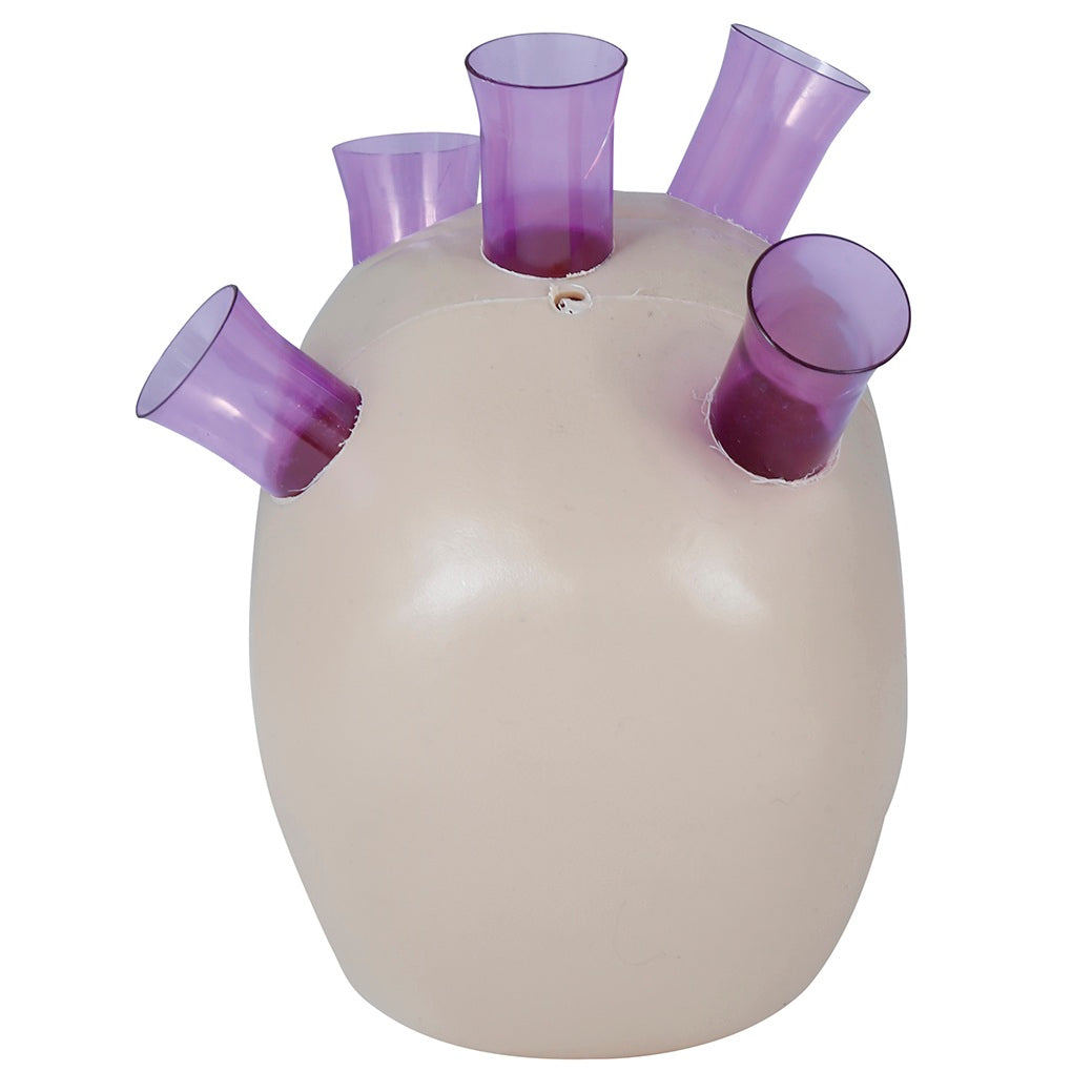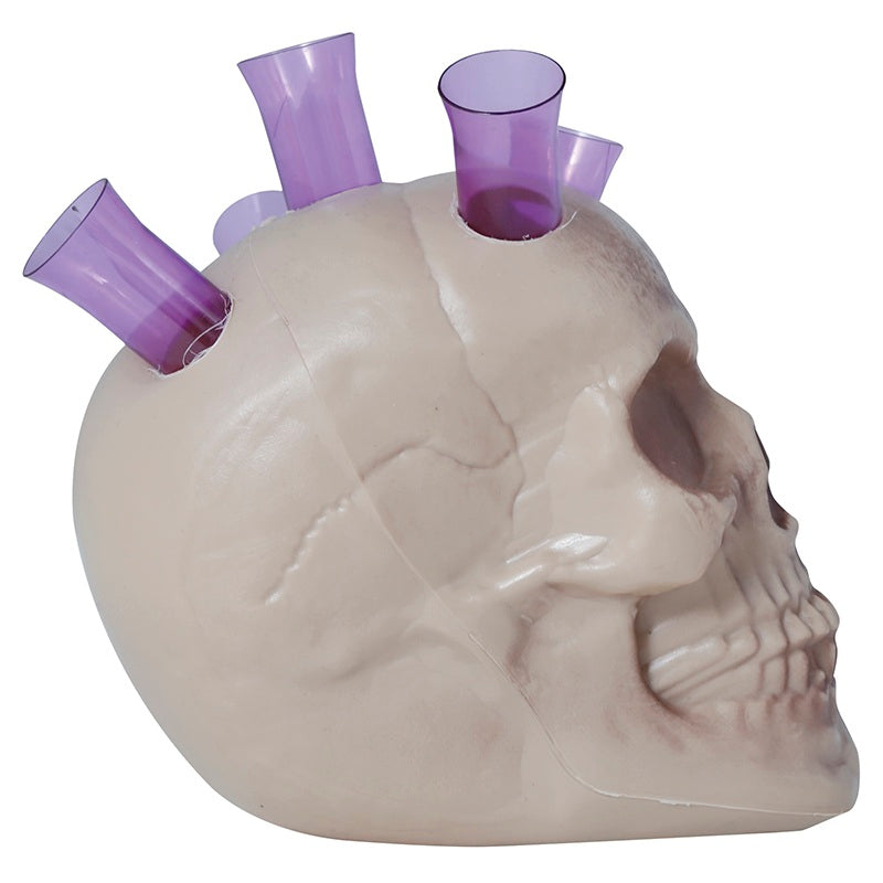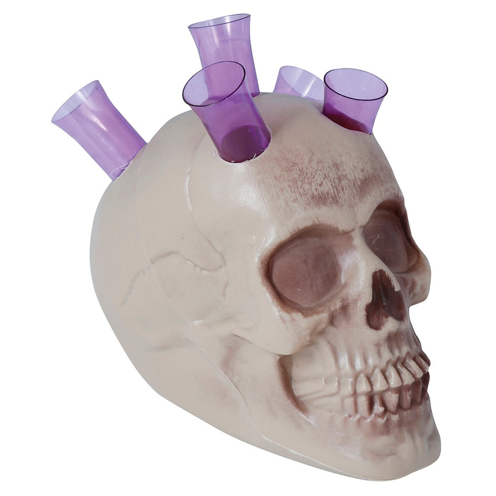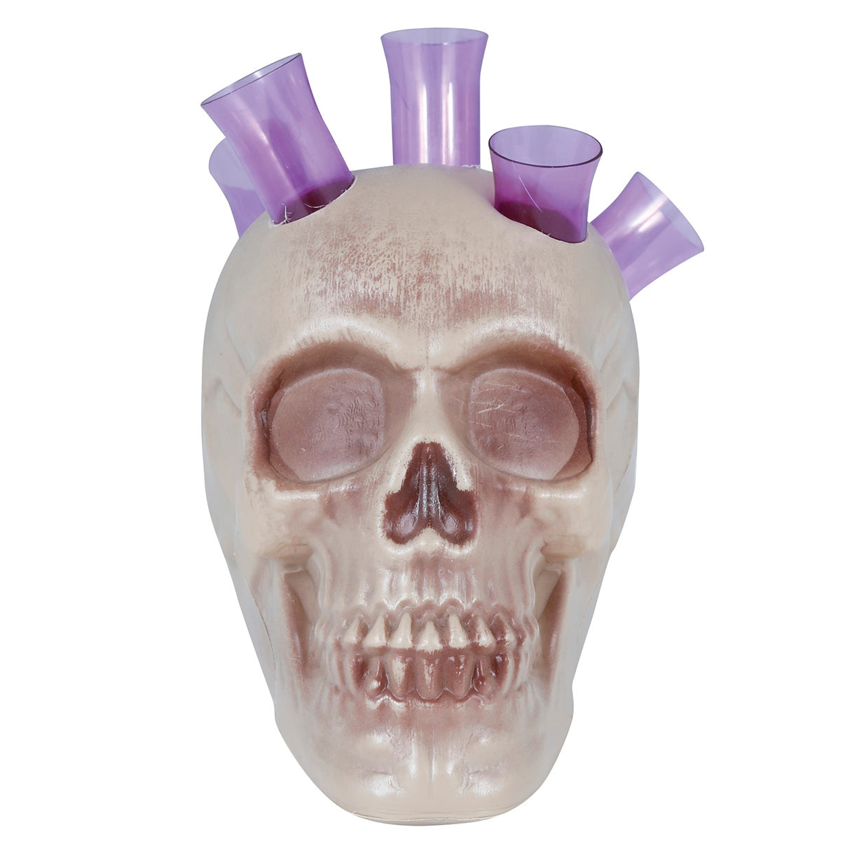 Dekorativ dödskalle i plast med 5 lila shotglas. Perfekt till Halloweenfesten som både serveringsbricka och bordsdekoration. Tillverkad i plast och enkel att rengöra.