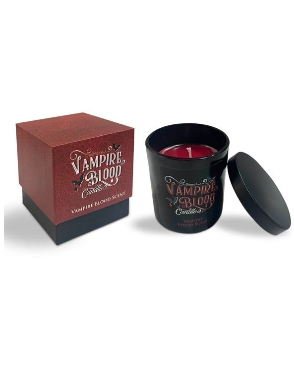Ett doftljus i glas levereras i en elegant presentförpackning och bär texten "Vampire Blood Candle!". Ljuset har en behaglig doft av vanilj med fruktiga inslag och mäter cirka 8 x 8 centimeter.