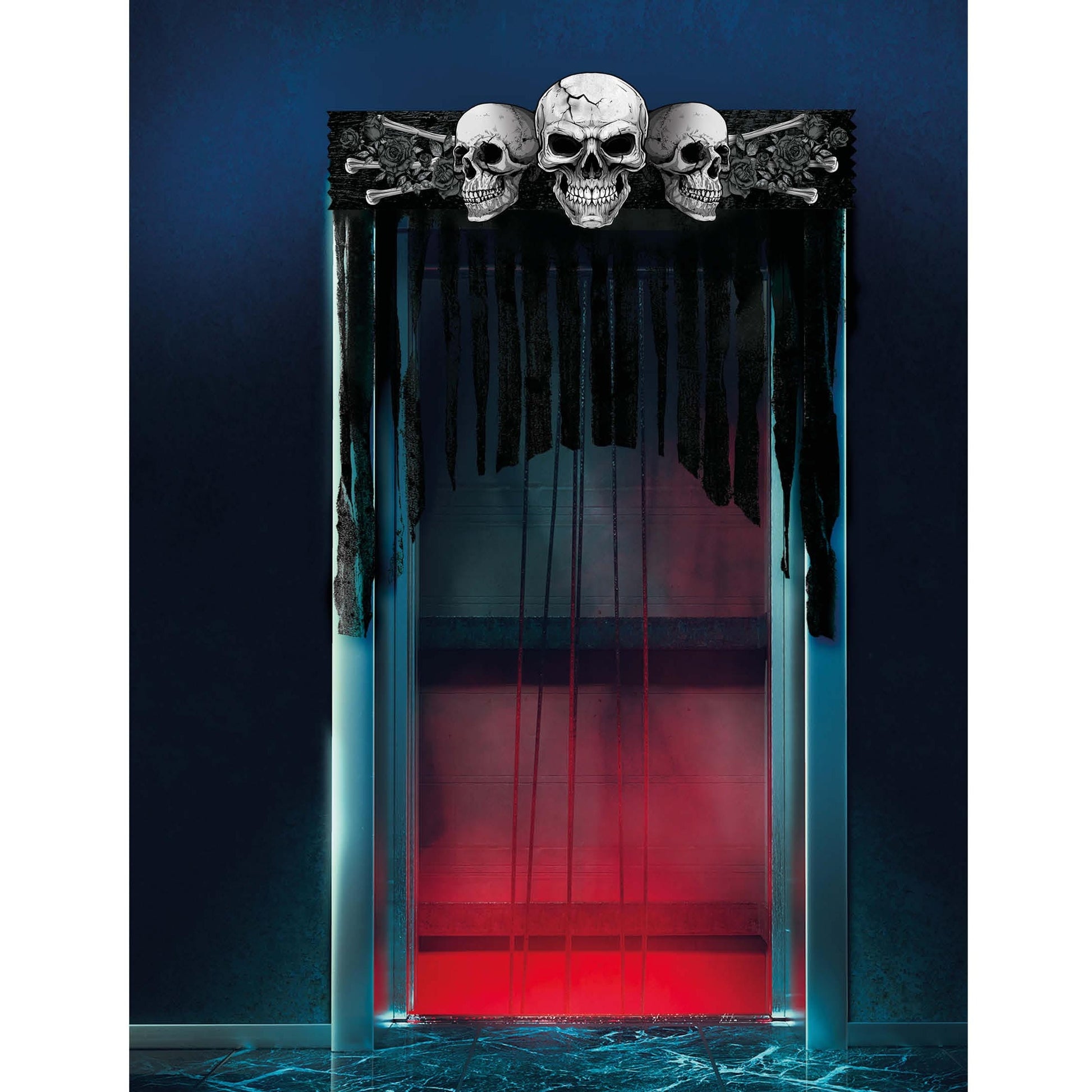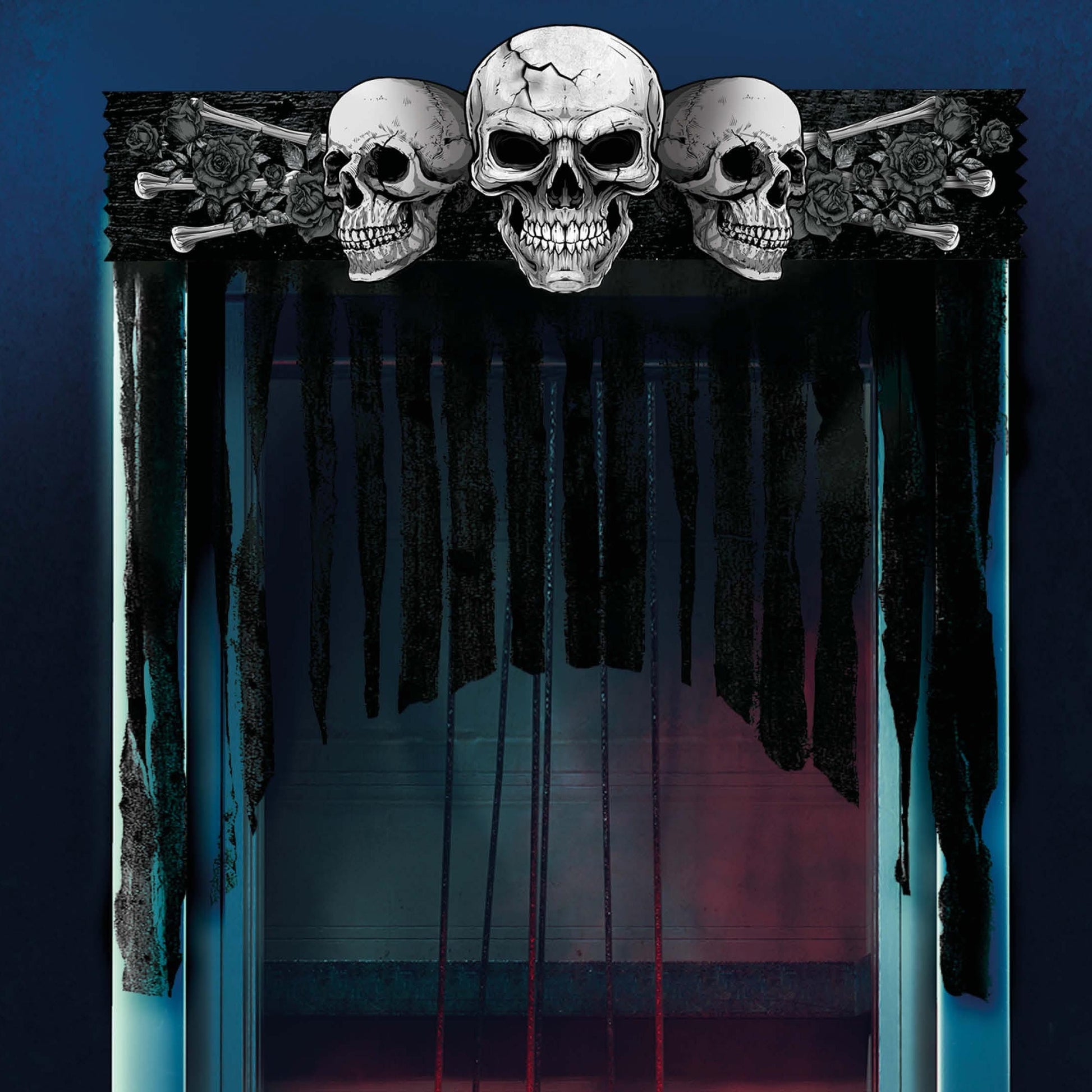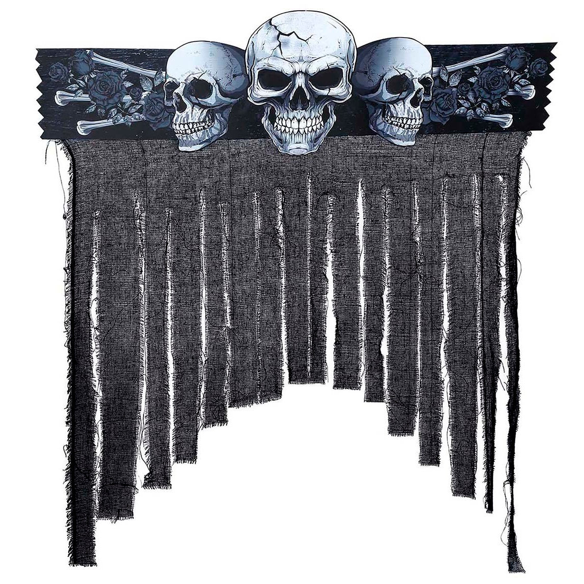 Tunn dekorationsgardin med dödskallemotiv, perfekt att hänga i dörröppningar inför Halloween eller temafester. Lätt att sätta upp och flyttar sig smidigt när man går igenom.