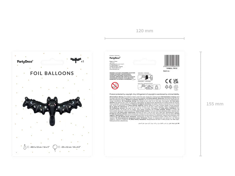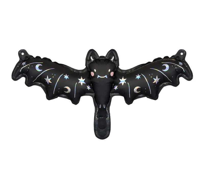 Foliebalong i form av en fladdermus i svart med holografiskt tryck. Storlek före uppblåsning ca 40,5 x 13 cm, efter uppblåsning ca 35 x 12 cm. Blås upp med luft. Setet innehåller sugrör för uppblåsning.
