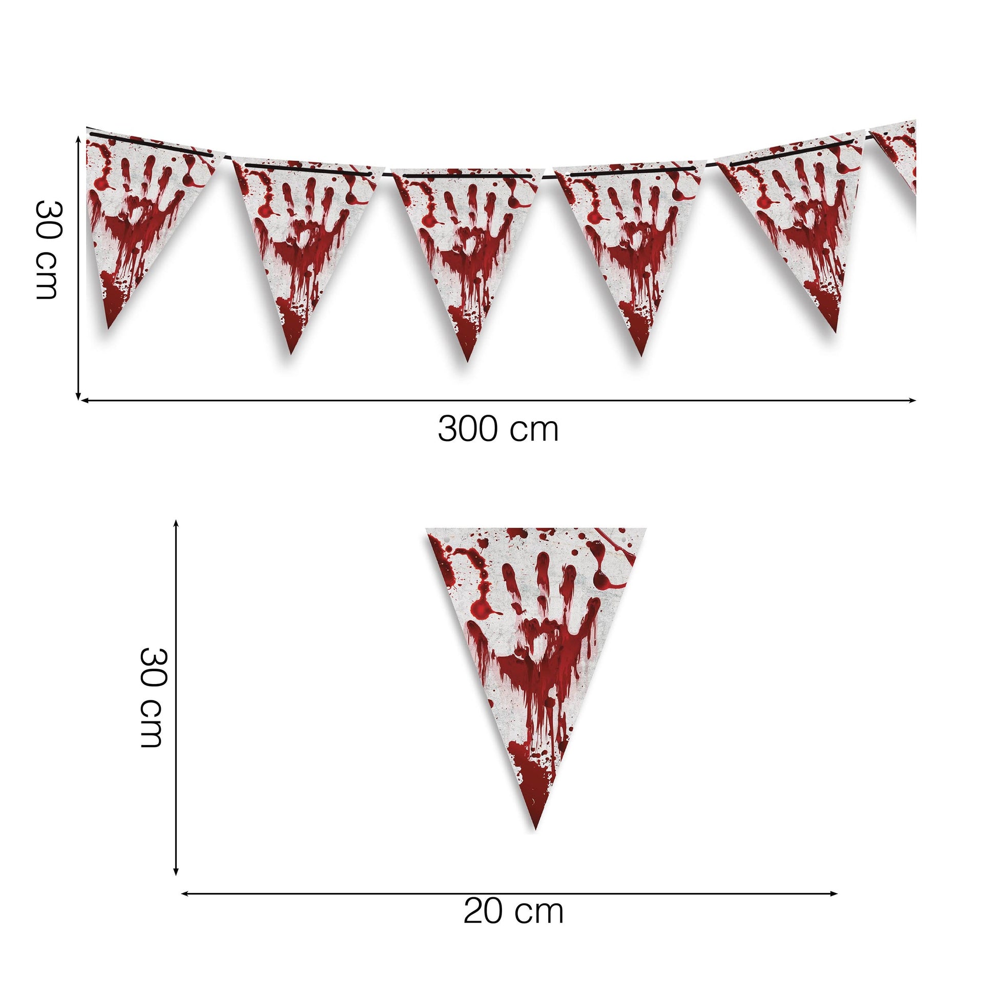 Girlang med blodiga handavtryck – en snabb och enkel dekoration till Halloween. Innehåller flera vimplar (20 x 30 cm styck) på en lina som är totalt 3 meter lång.