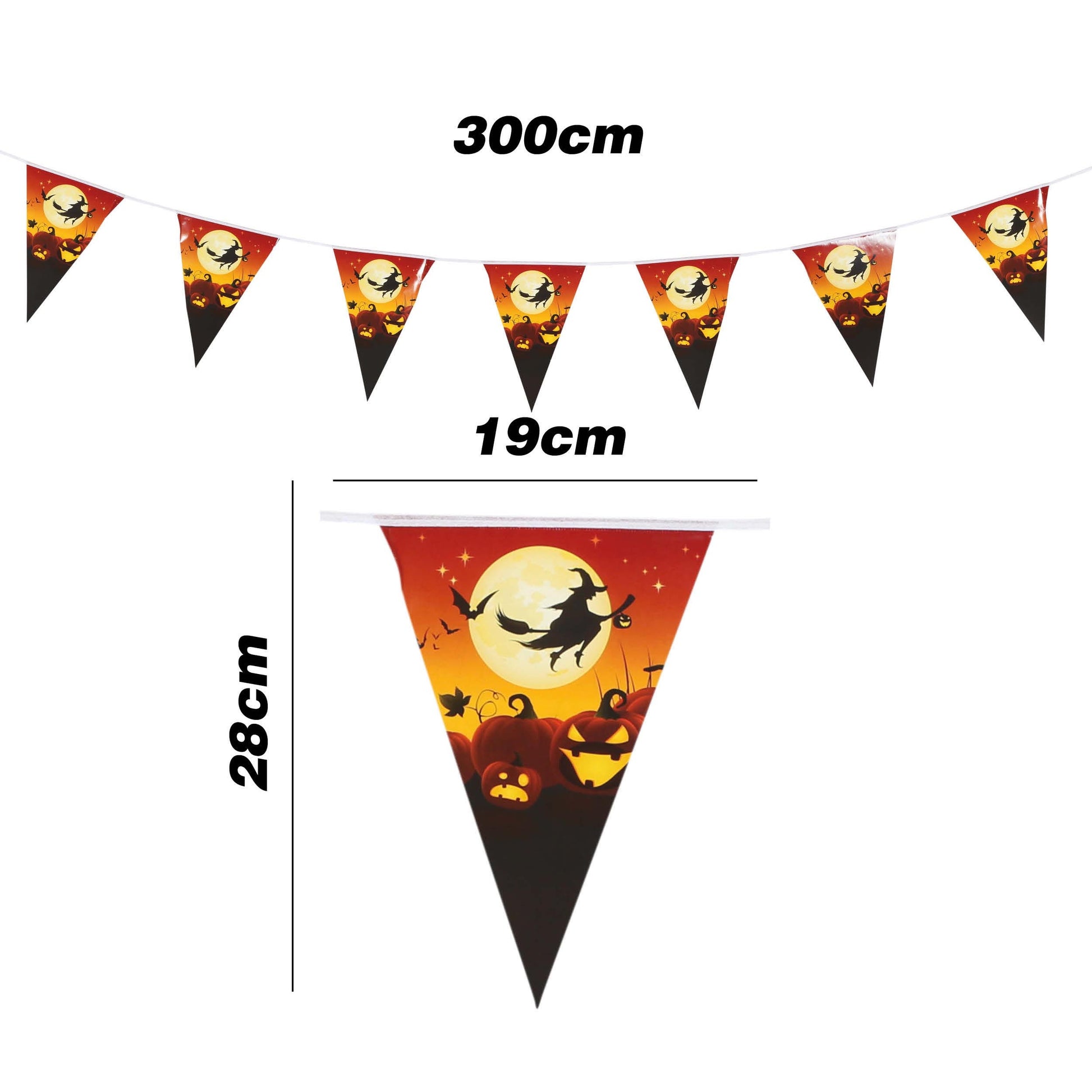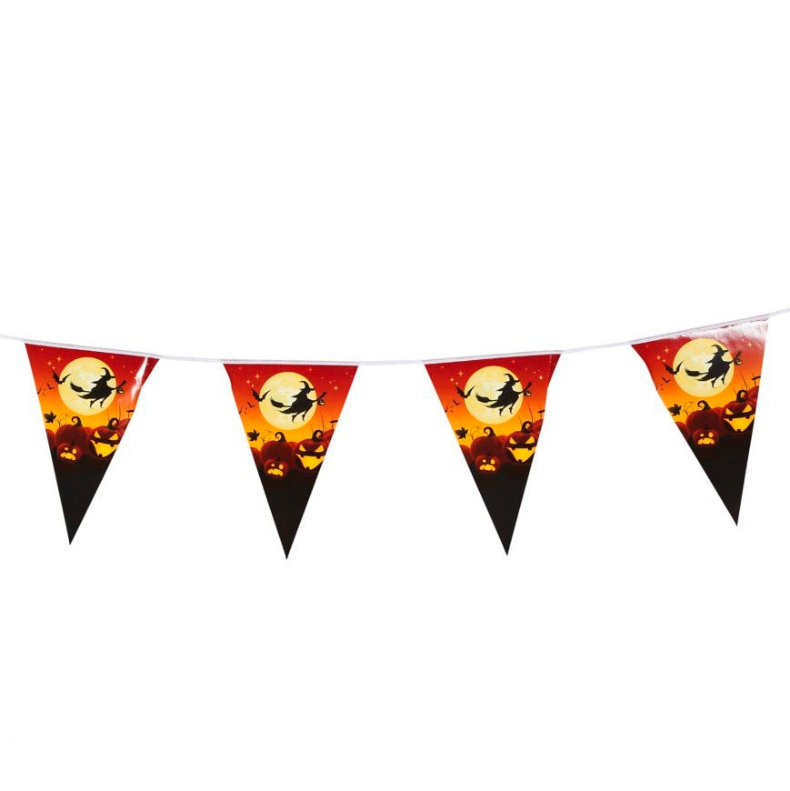 Girlang med häxmotiv – perfekt som enkel dekoration till Halloween eller temafest. Består av flera vimplar (20 x 30 cm) på en 3 meter lång lina.