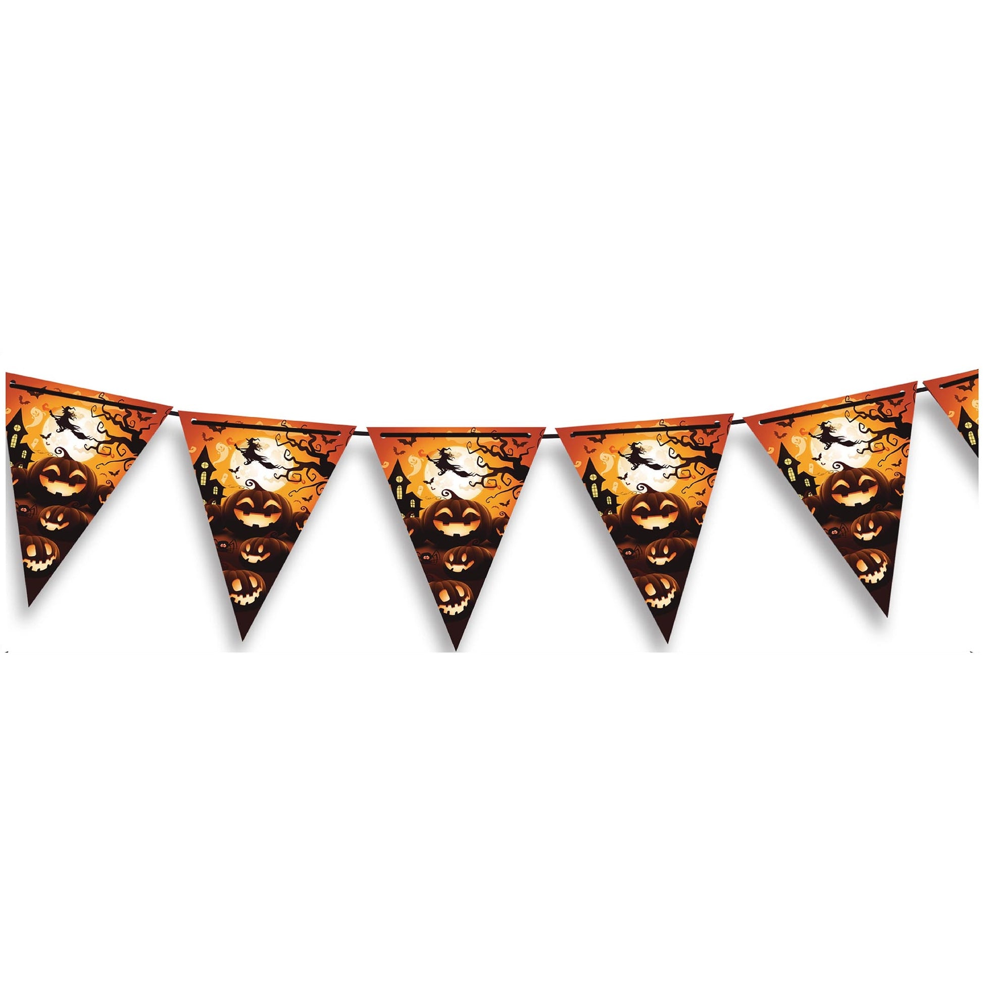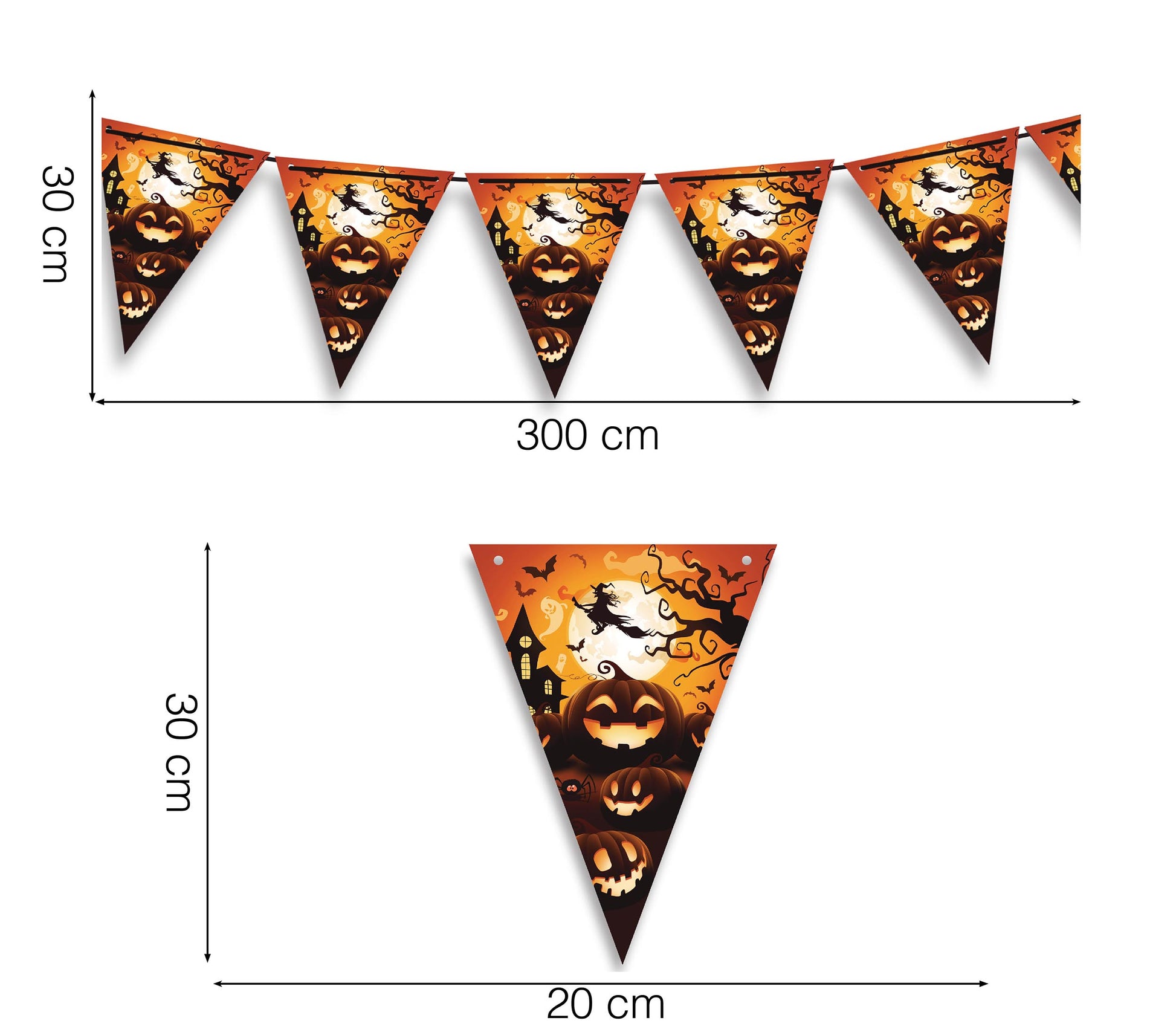 Klassiskt girlang med pumpamotiv – perfekt för att sätta rätt stämning till Halloween. Består av flera vimplar (20 x 30 cm) i plast, fästa på en 3 meter lång lina.