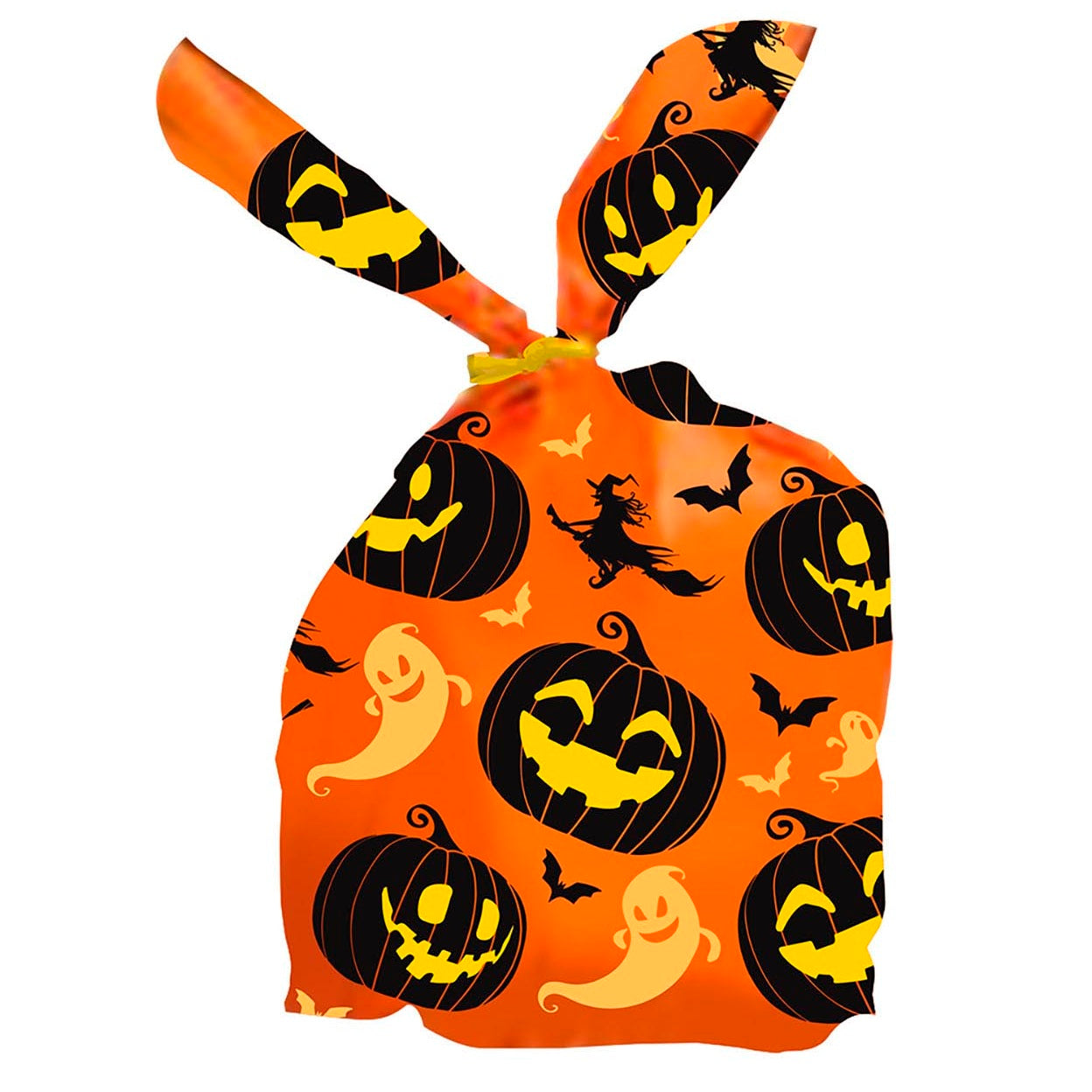 Förpackning med 20 färgglada påsar med Halloweenmotiv – leende pumpor tillsammans med spöken, häxor och fladdermöss. Perfekta för godisutdelning, kalas eller som festpåse.