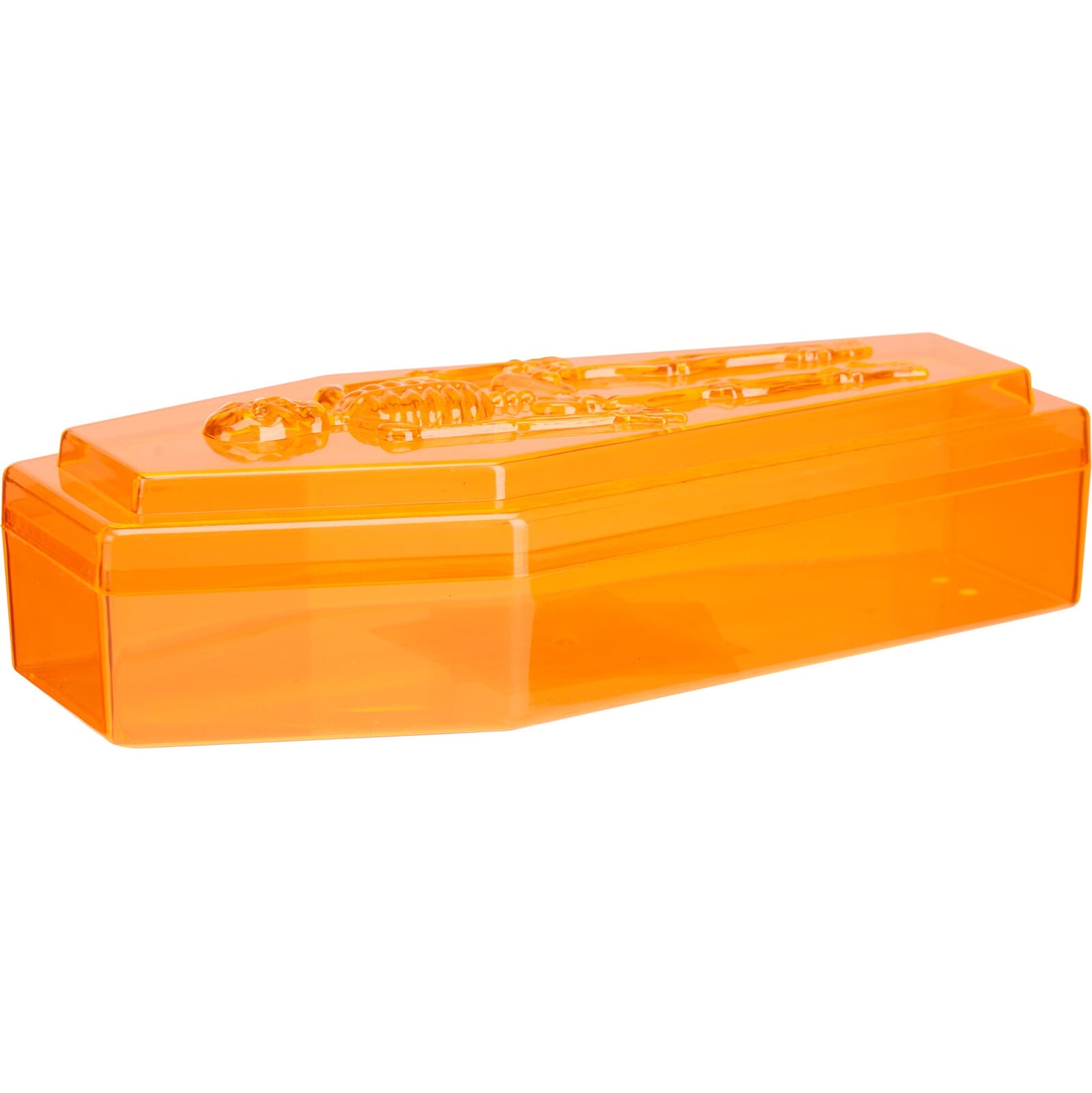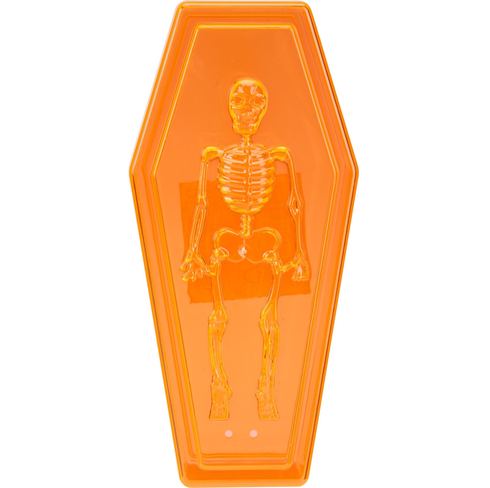En halloweenkista i plast med lock i orange glasfärg och en detaljrik 3D-skelettdesign på locket. Perfekt att fylla med godis, små presenter eller använda som en läskig dekoration på festen.