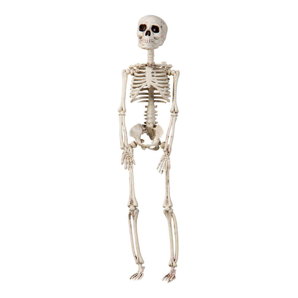 Hängande skelett, ca 29 cm. Tillverkad i plast med rörliga ben och armar. Perfekt som dekoration till halloween, temafest eller skräckmiljö. Enkel att hänga upp i fönster, tak eller dörröppning.