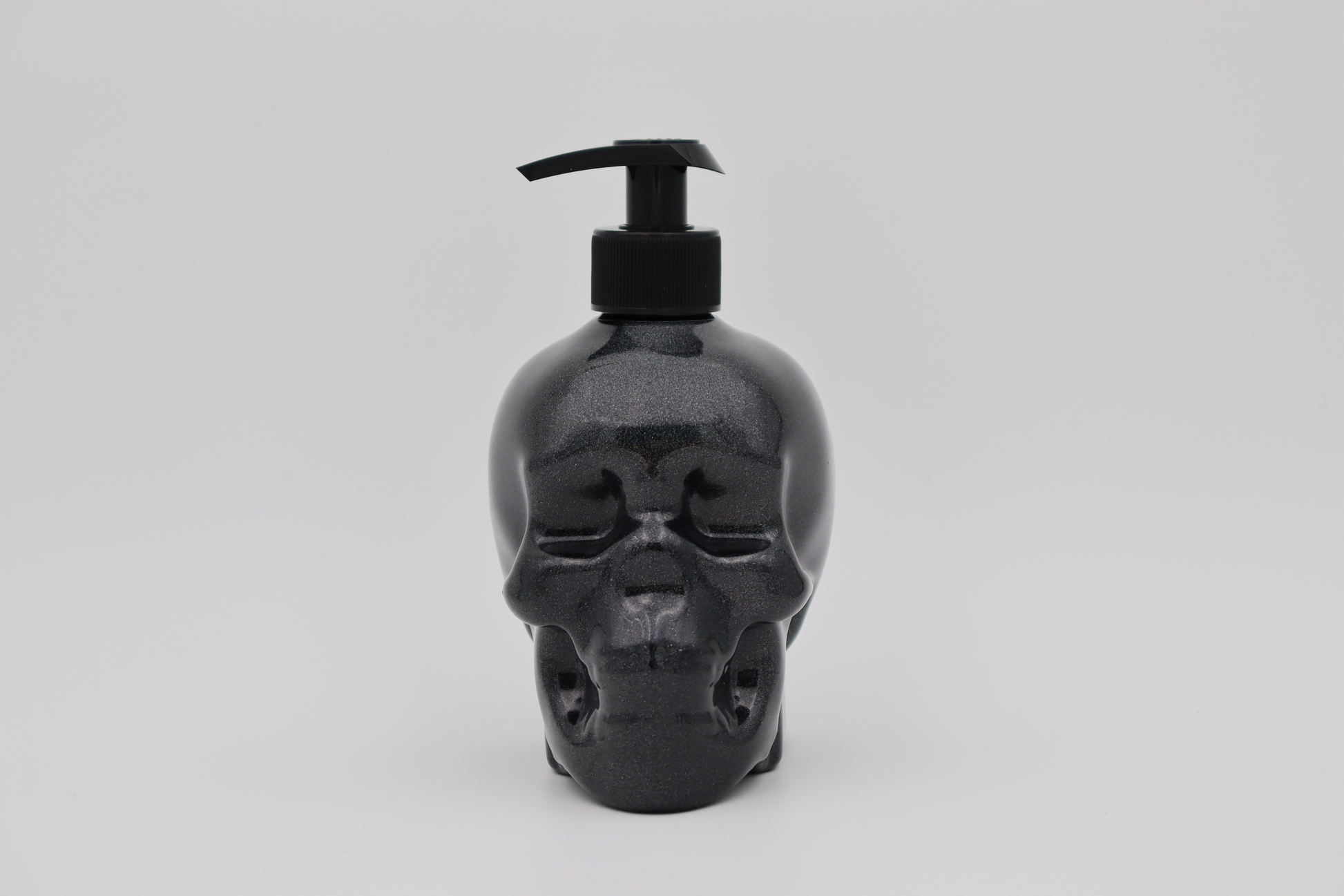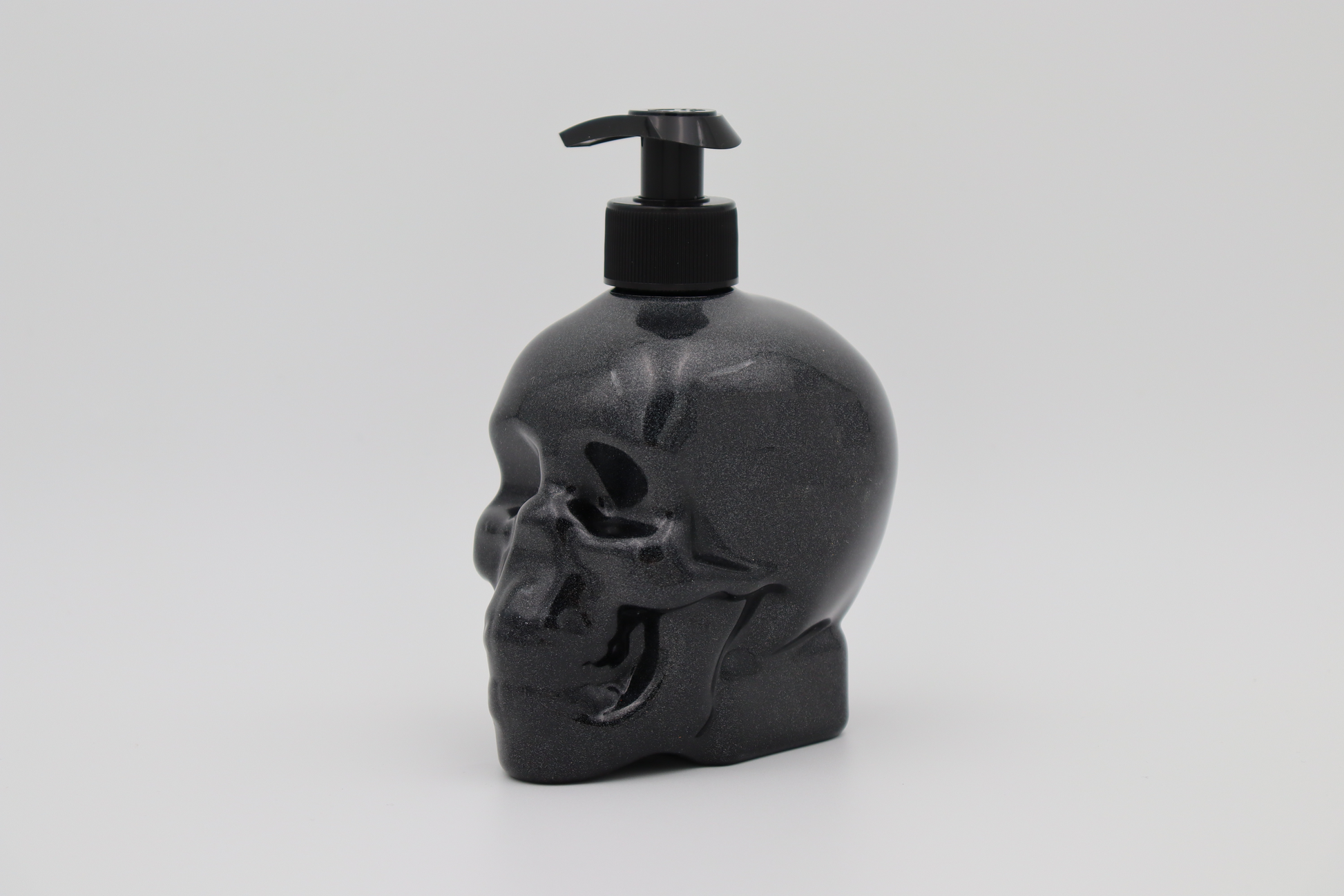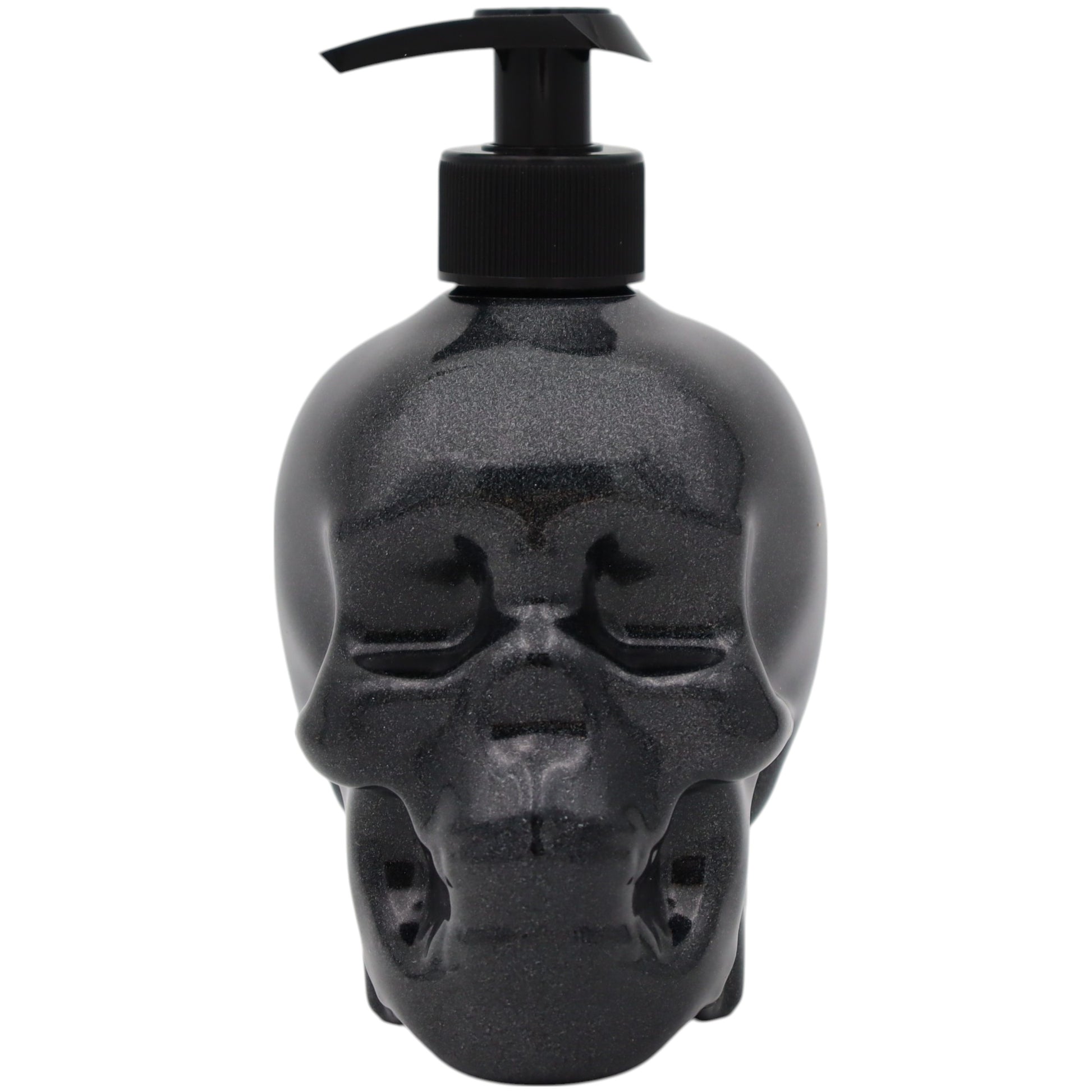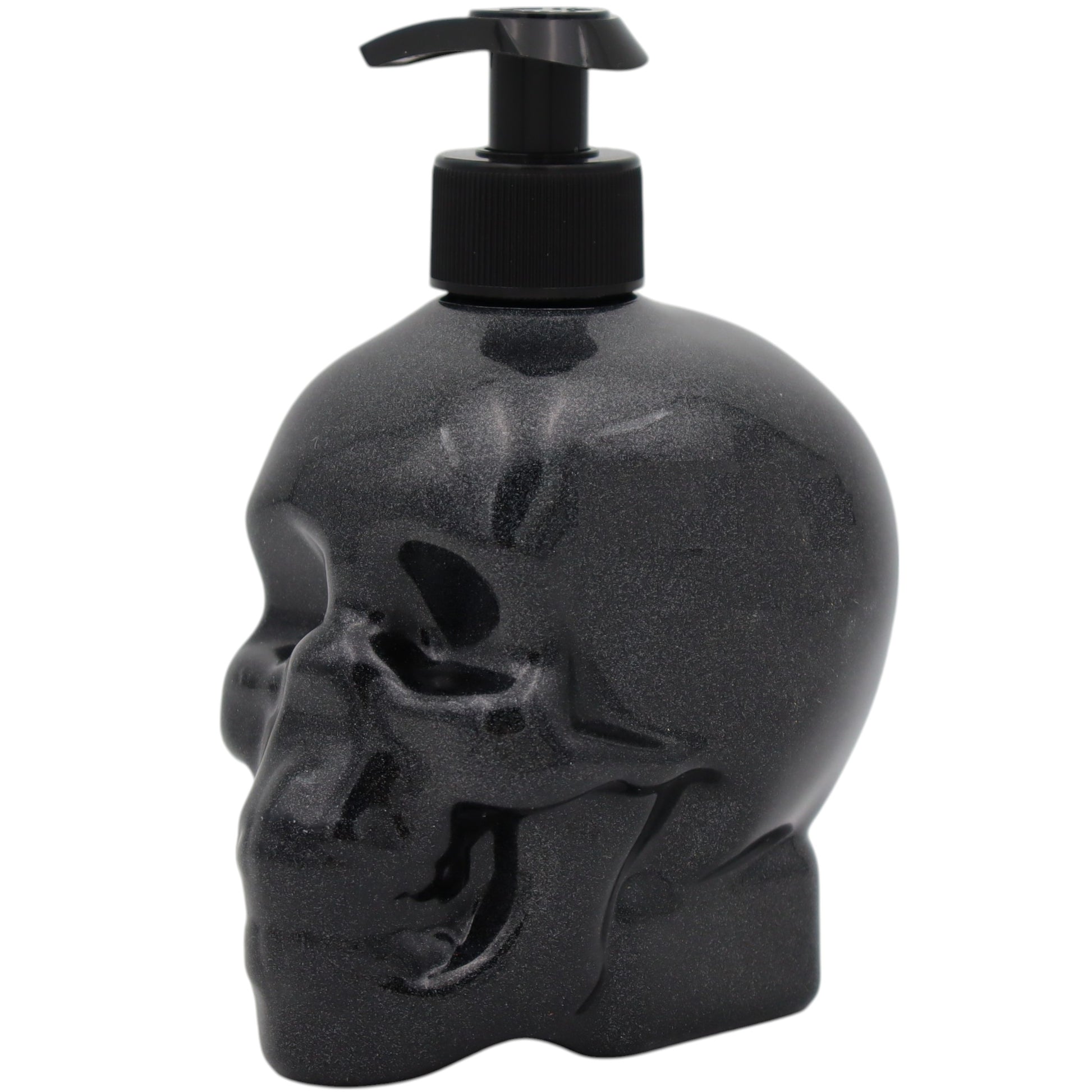 Praktisk och snygg handtvål i svart dödskalleflaska, som passar perfekt i badrum eller kök. Innehåller 500 ml tvål med en behaglig doft av läder och sandelträ.