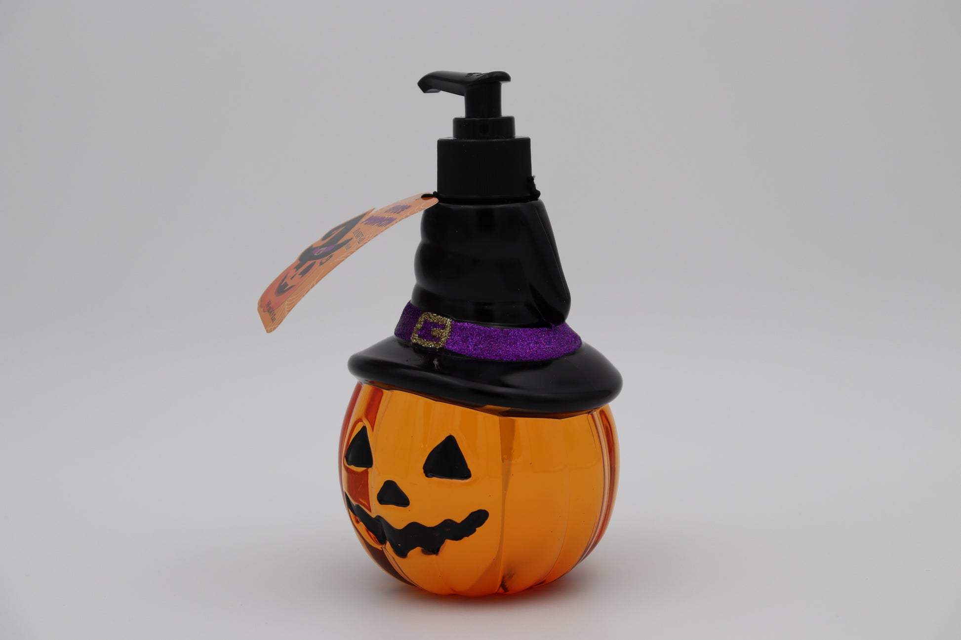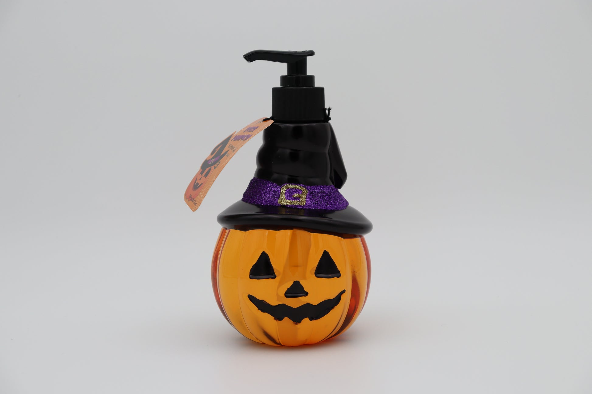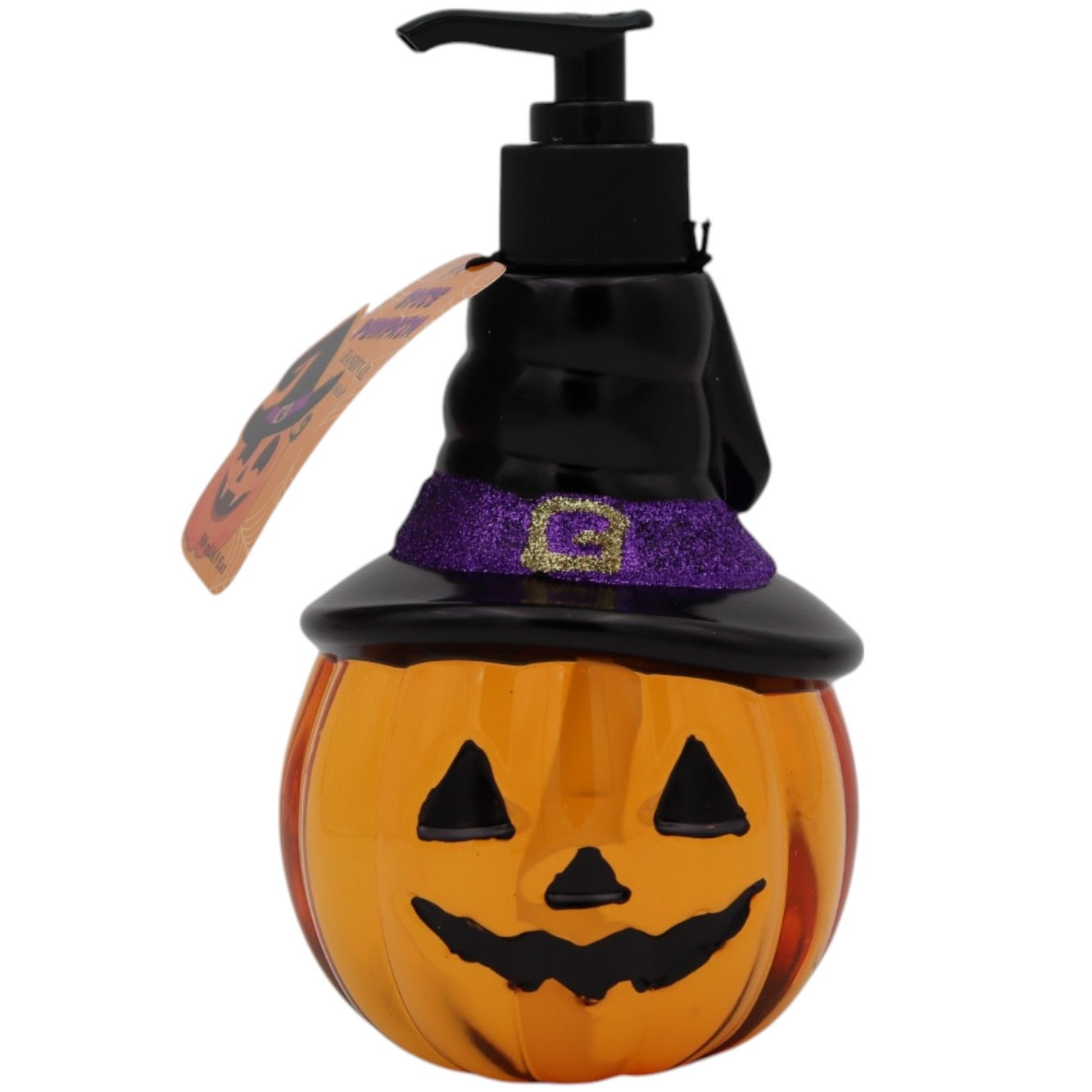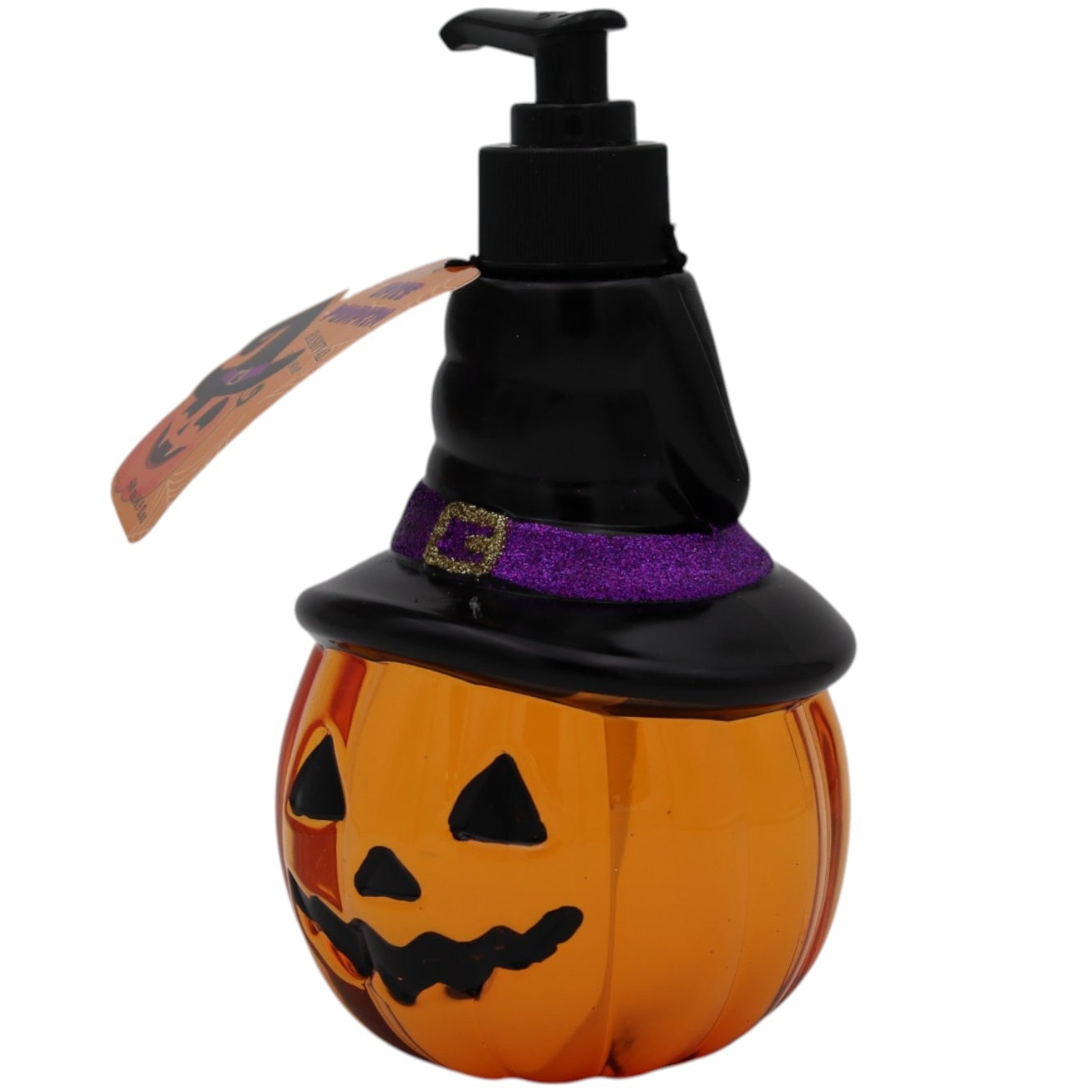 Gör handtvätten till en fest med denna Spice Pumpkin Handtvål – en rolig och dekorativ tvålflaska formad som en utkarvad pumpa (jack-o’-lantern), komplett med en häxhatt på toppen!