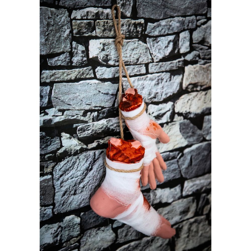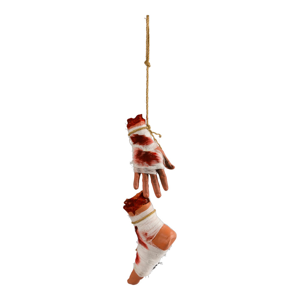 Hängande dekoration med blodig avhuggen hand och fot, sammanbundna med ett rep. En skrämmande effektfull detalj till halloween som skapar rätt stämning i vilken skräckmiljö som helst.