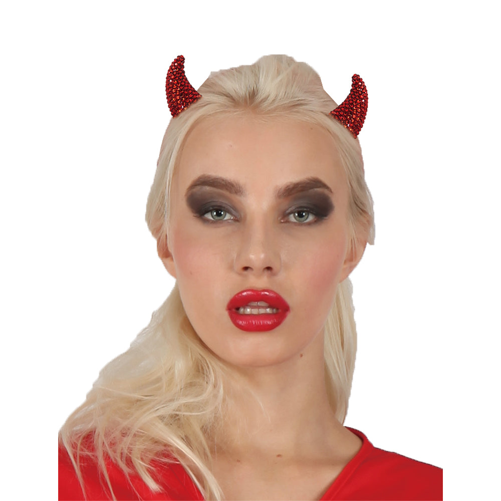 Djävulshorn med strass, fästs enkelt i håret med klämmor. En glittrande och smidig accessoar för halloween, maskerad eller temafest.