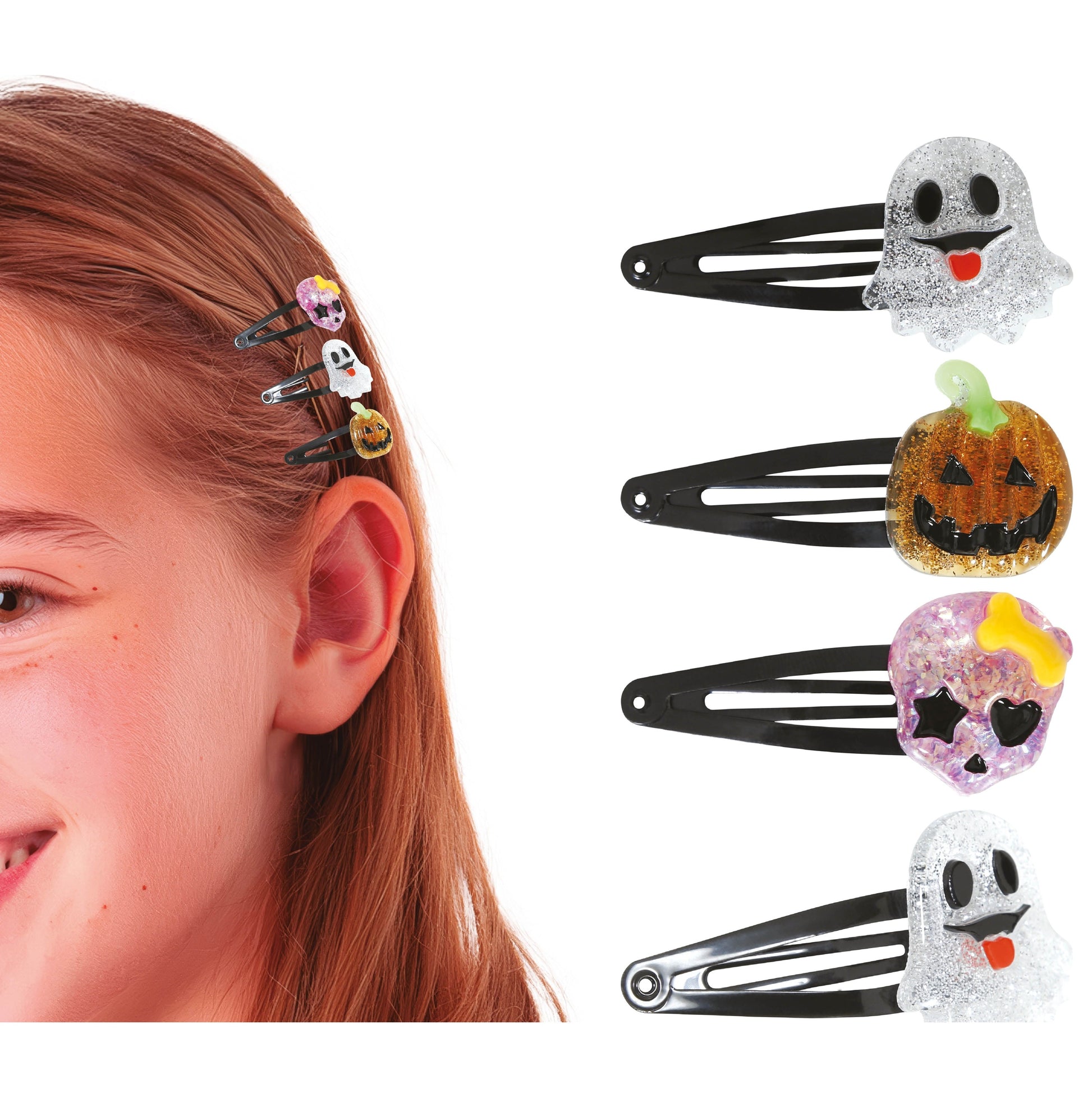 Ett färgglatt set med tre hårspännen i halloweenstil. Motiven är spöke, pumpa och en rosa dödskalle – roliga detaljer som gör frisyren både lekfull och festlig. (OBS: Produktbilden visar fyra klämmor eftersom spökspännet visas två gånger).