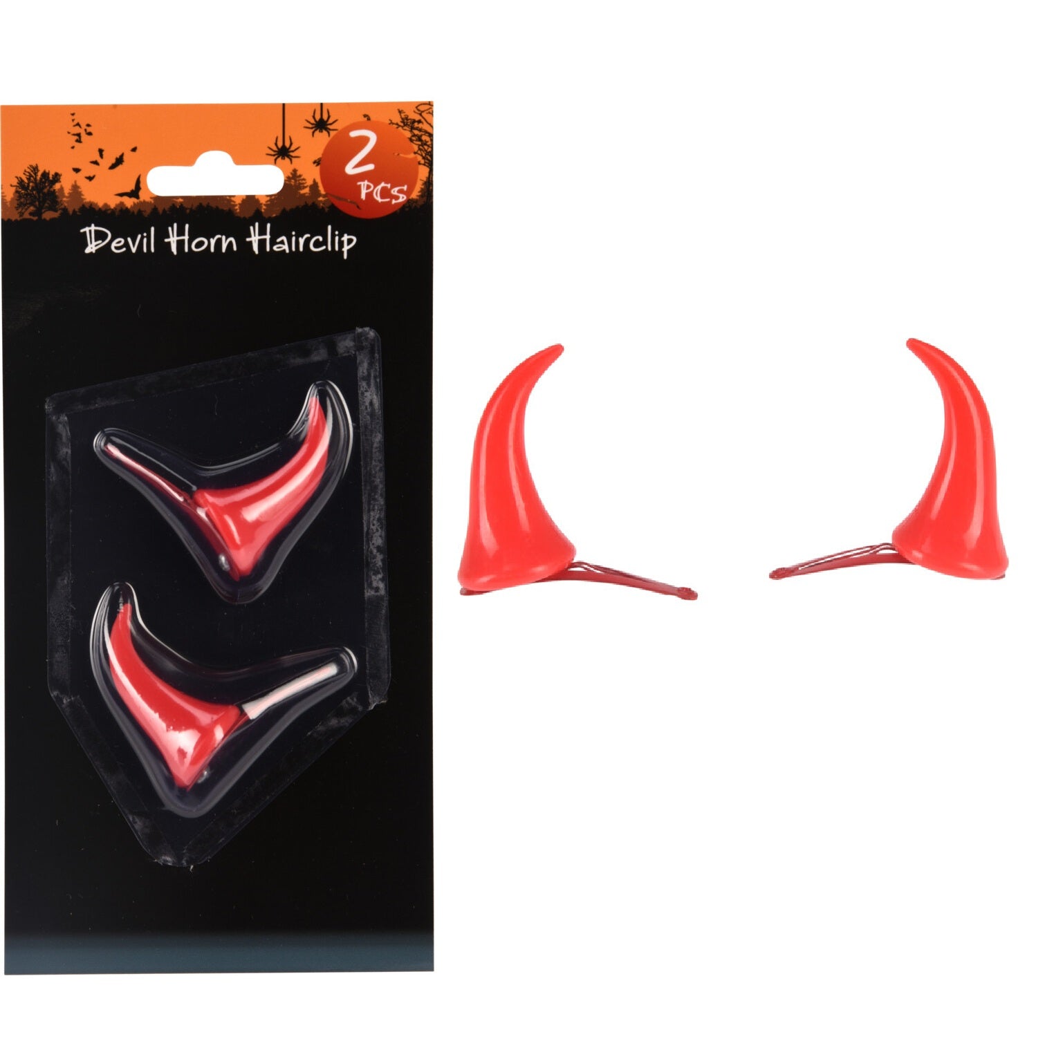 Ett par små djävulshorn, ca 4 cm höga, fästa på hårspännen för enkel användning. Perfekta som en lekfull halloweenaccessoar eller som en snabb lösning till maskeraden.