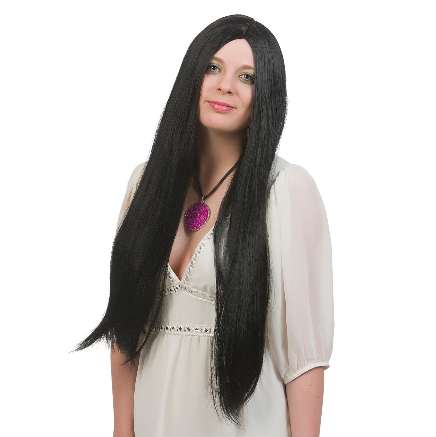 Lång svart peruk för vuxna, tillverkad av PET. Passar perfekt som komplement till halloweenkostymer, maskerad eller teater.