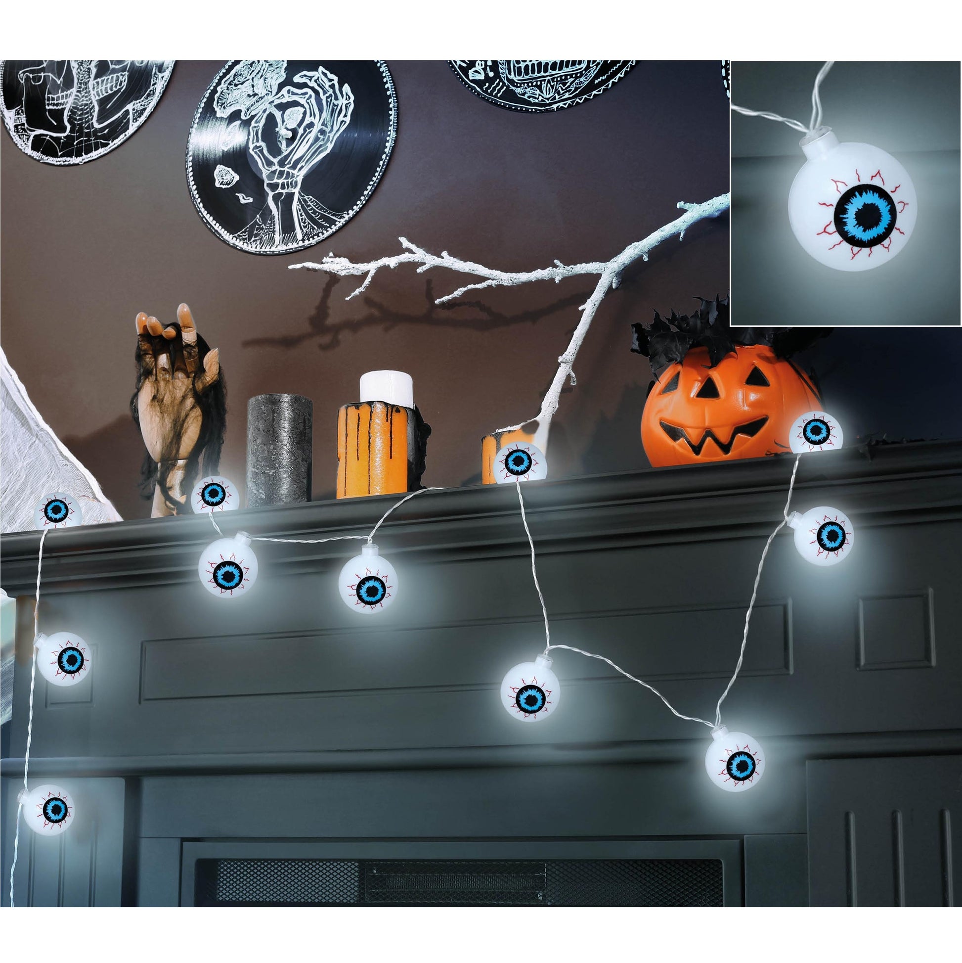 En kusligt rolig ljusslinga med 10 lysande ögon som ger rummet en perfekt halloweenstämning. Slingan är 130 cm lång och drivs av 2 st AA-batterier (ingår ej). Perfekt för att dekorera festlokalen, fönstret eller balkongen.