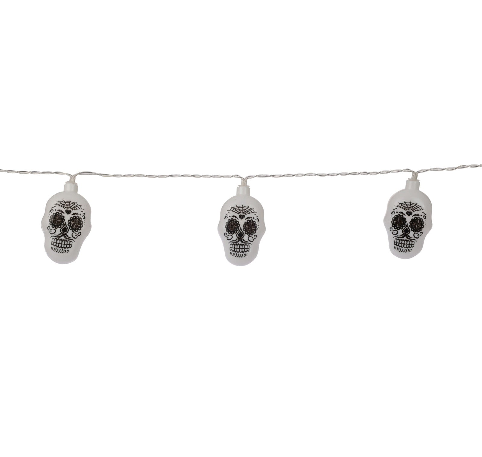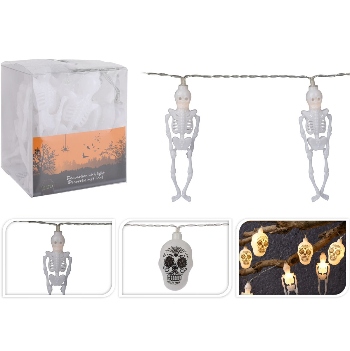En kuslig ljusslinga med 10 lampor formade som dödskallar eller skelett – perfekt för att skapa rätt stämning på halloweenfesten eller som läskig dekoration hemma.