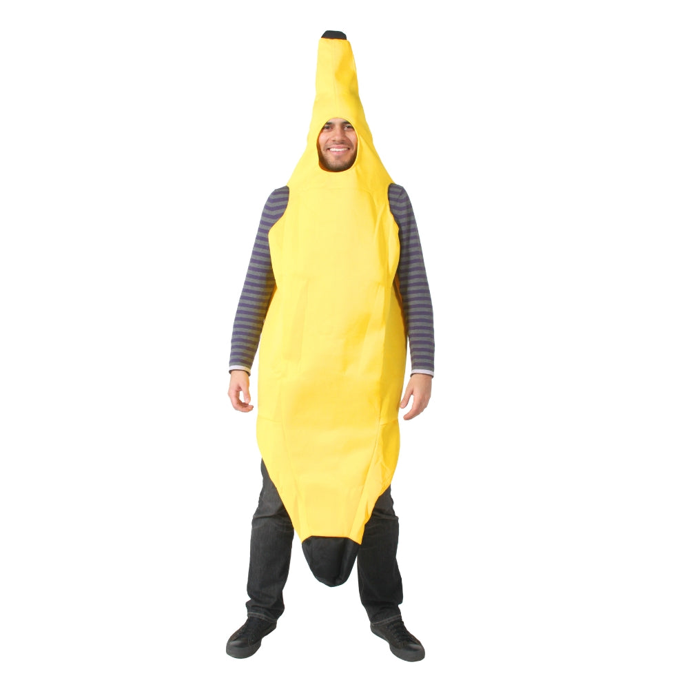 En humoristisk och iögonfallande dräkt formad som en banan. Tillverkad i lätt polyester och enkel att ta på över vanliga kläder. Perfekt för den som vill sticka ut på festen eller Halloween.