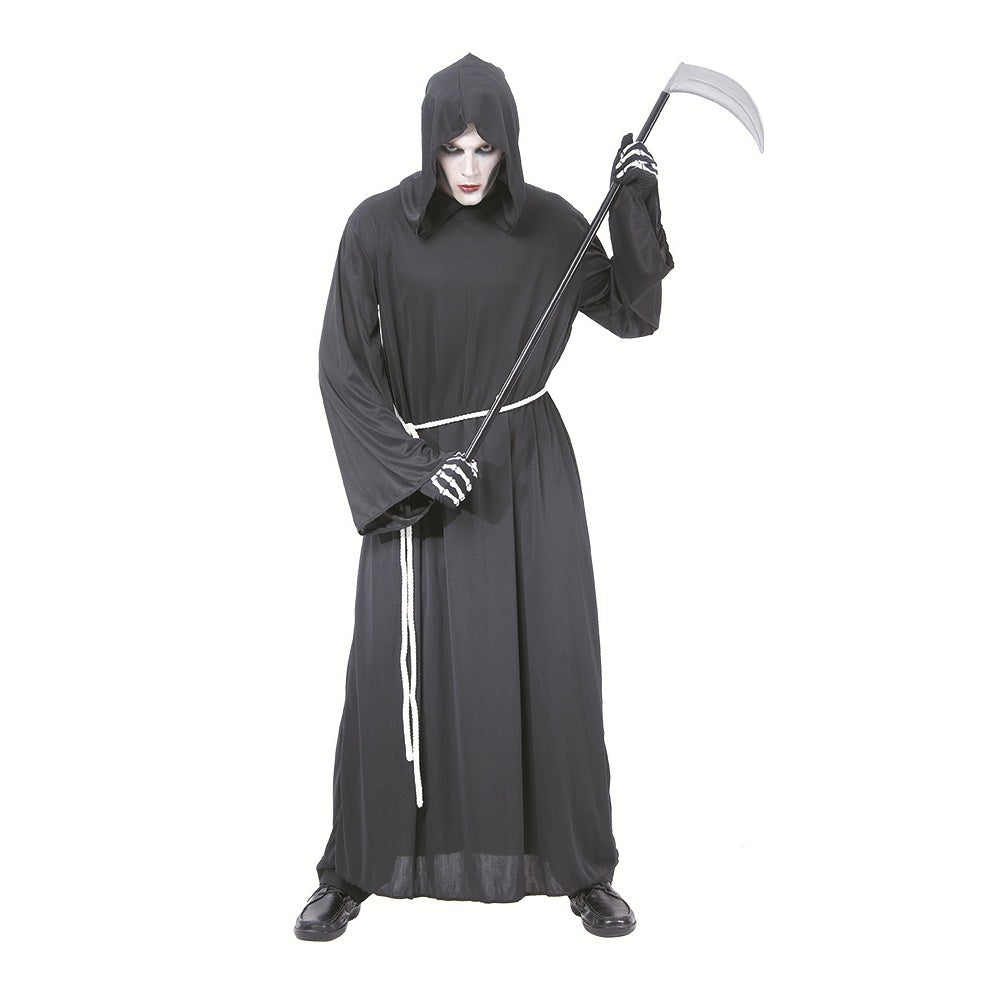 Maskeraddräkt Grim Reaper – en skrämmande klassiker till halloween. Innehåller heldräkt i form av kåpa med huva samt bälte. Perfekt för att gestalta dödens lieman.