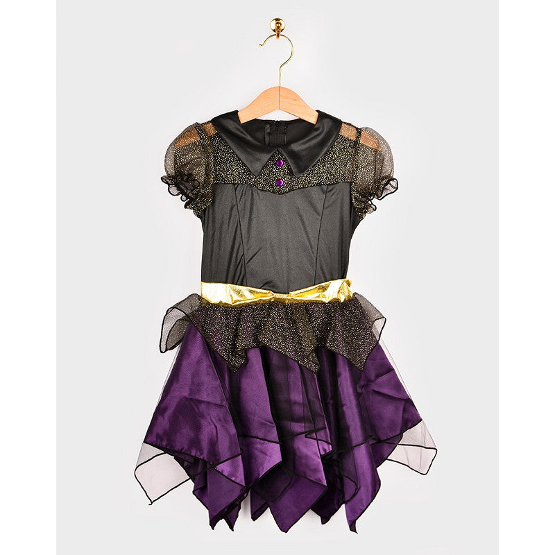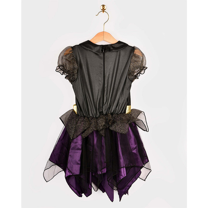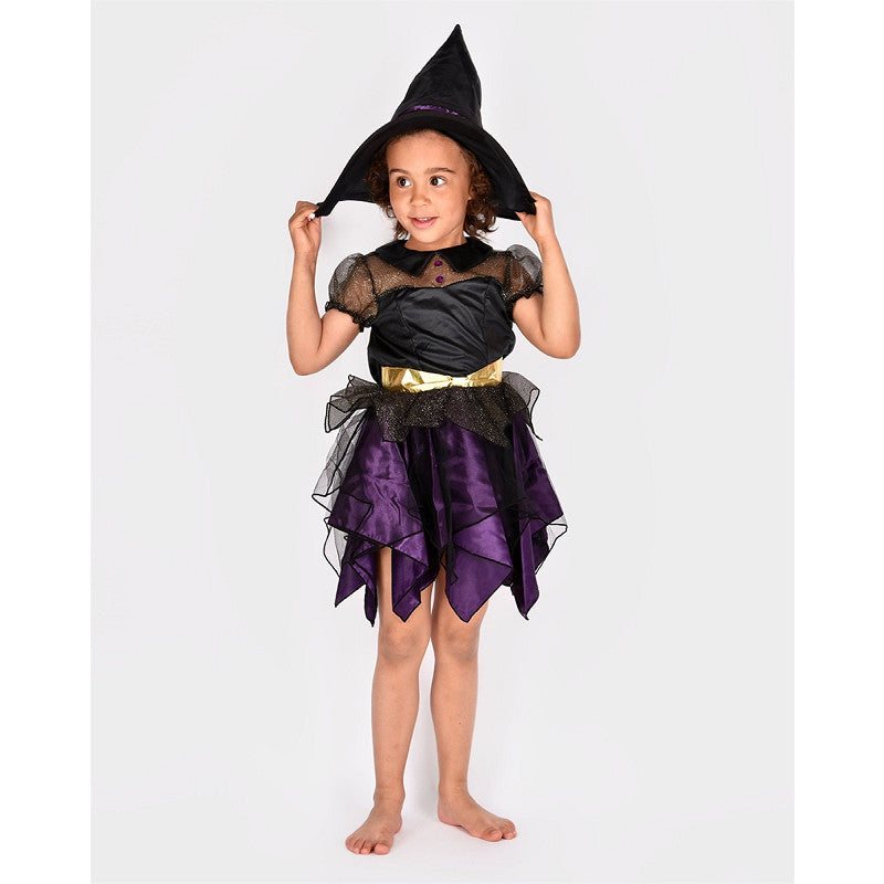 Deluxe häxdräkt för barn med svart klänning och matchande hatt. Dekorerad med lila och guldfärgade detaljer för ett elegant och magiskt utseende. CE-märkt.