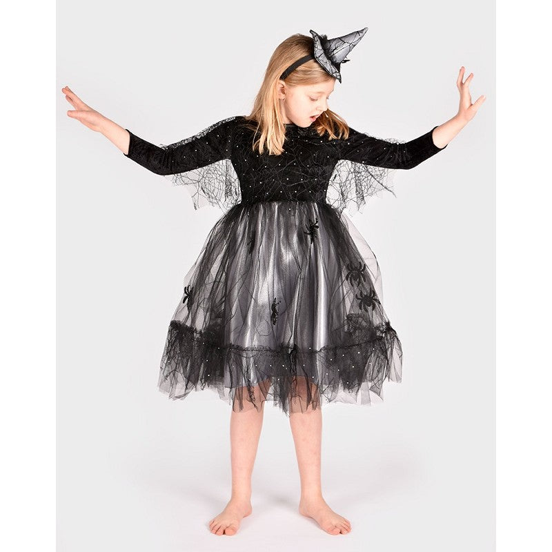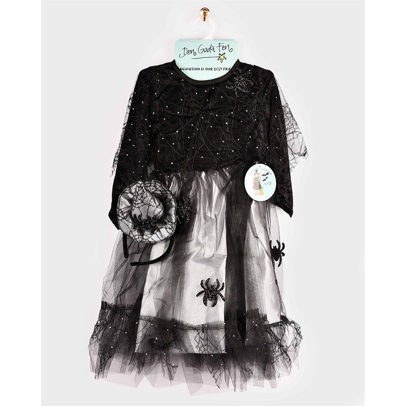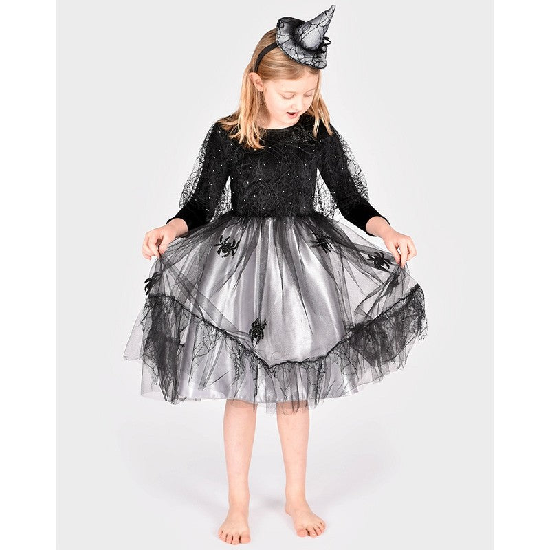 Häxdräkt för barn i svart och silver med spindeldetaljer, levereras med tillbehör inklusive en mini-häxhatt. Perfekt för maskerad och halloween. CE-märkt.