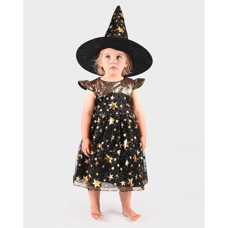 Häxdräkt för barn med svart klänning och matchande hatt. Utsmyckad med guldfärgade detaljer, inklusive stjärnor, för ett klassiskt häxutseende. CE-märkt.