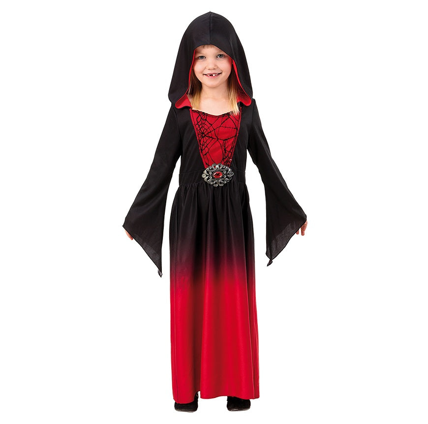 Barnkostym i form av en röd och svart klänning med huva. En fantasifull dräkt som passar utmärkt för halloween, maskerad eller sagotema. Tillverkad av 100 % polyester.