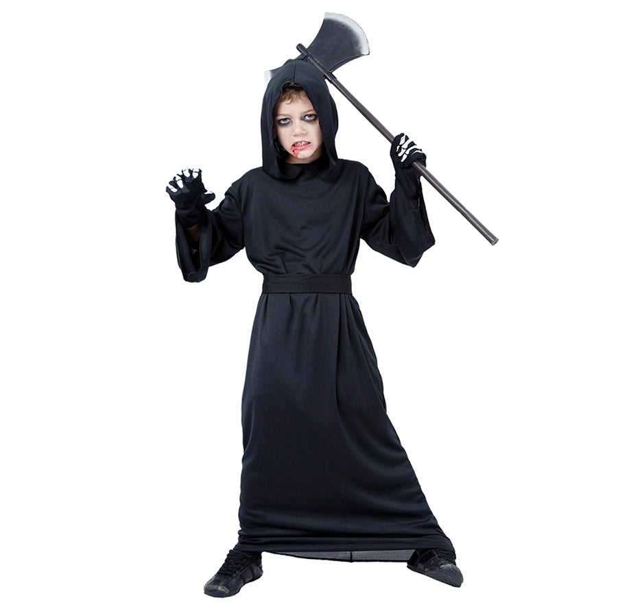 Maskeraddräkt för barn i form av en Reaper-kåpa – enkel och smidig för halloweenfirandet. Innehåller kåpa med huva och skärp. Tillverkad av 100 % polyester. Perfekt för en skrämmande men bekväm utklädnad. Yxan ingår ej.