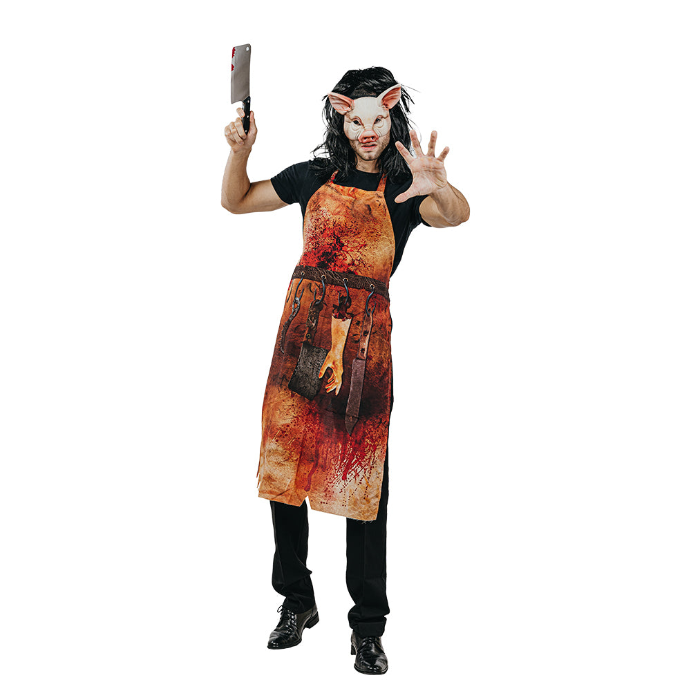 Maskeraddräkt "Butcher Pig" – en riktigt skrämmande halloweendräkt. Innehåller blodigt förkläde och grisliknande mask. Perfekt för dig som vill skapa en obehaglig och minnesvärd look till halloween eller skräcktemafest. Innehåller inte kniv.