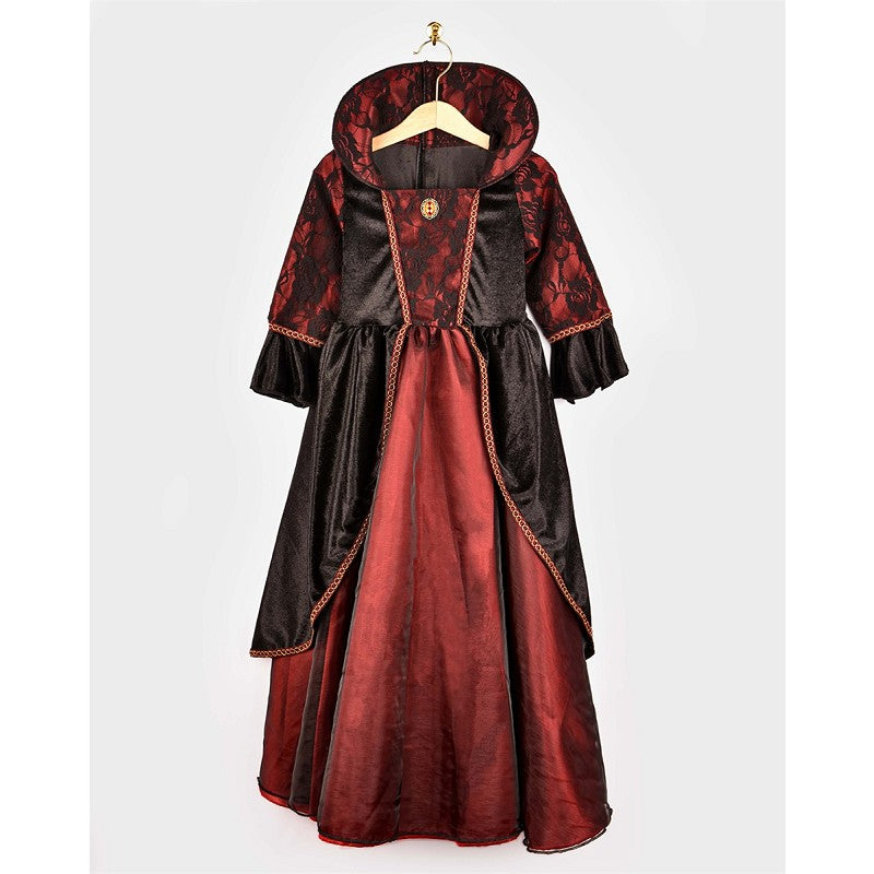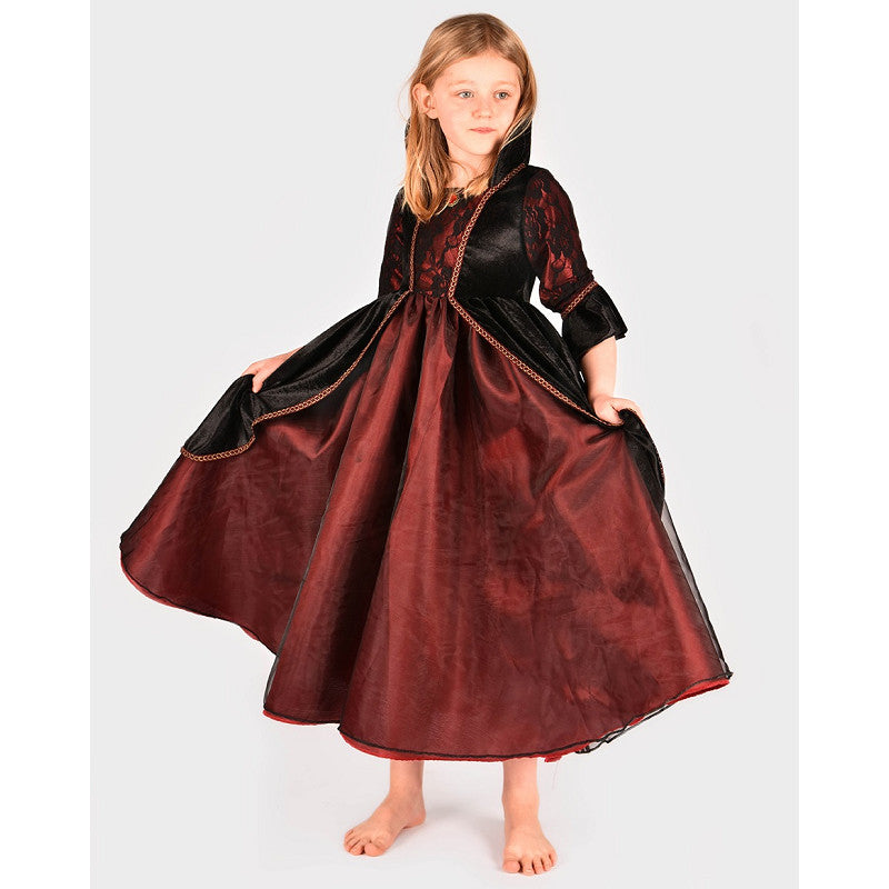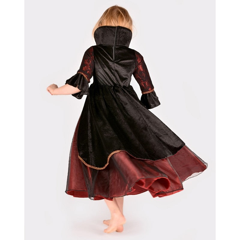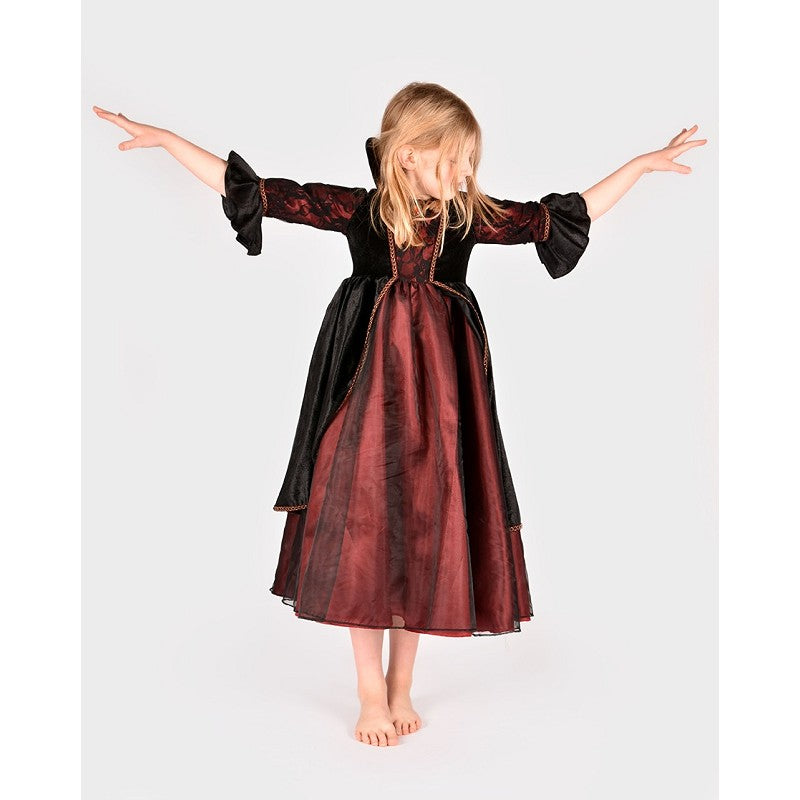 Deluxe maskeraddräkt för barn i form av en vampyrdrottning. Klänning i mörkrött och svart med eleganta detaljer för en dramatisk look. Tillverkad i bekväma material för lek och utklädnad. CE-märkt.