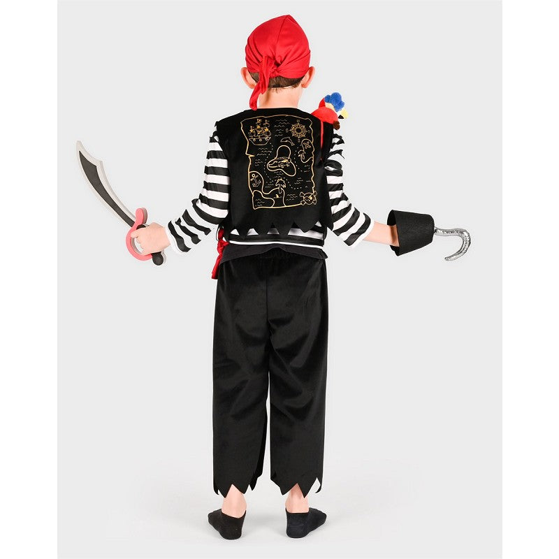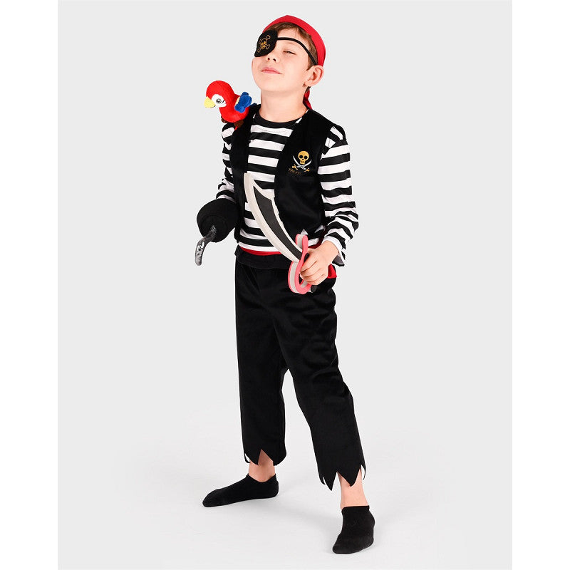 Piratset för barn med kläder och tillbehör. Innehåller ögonlapp, papegoja, svärd och krokhand. CE-märkt.