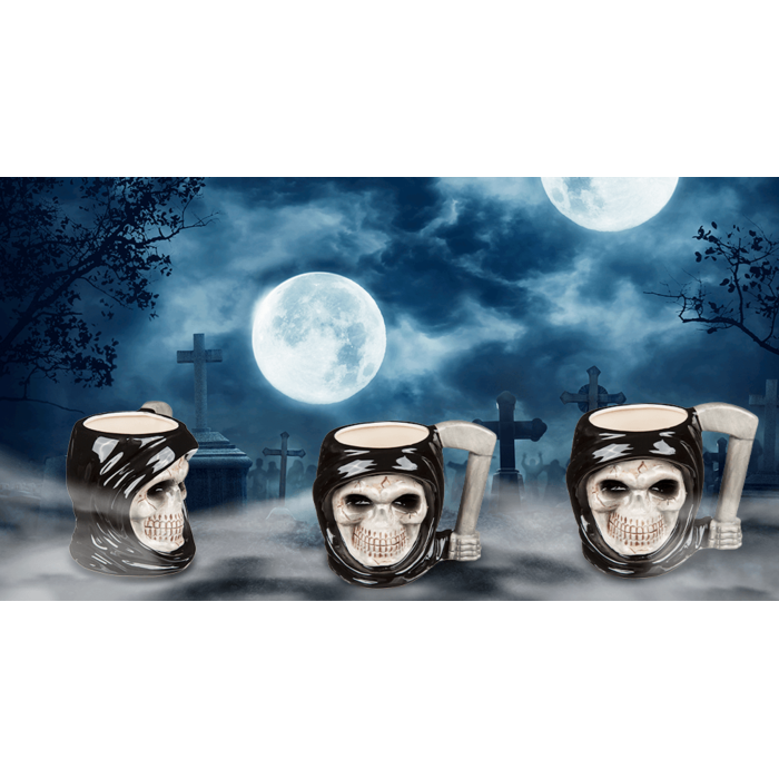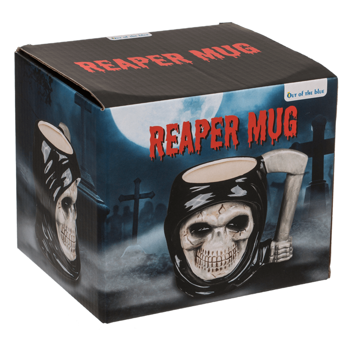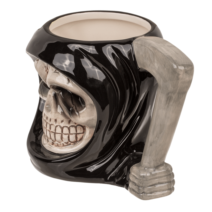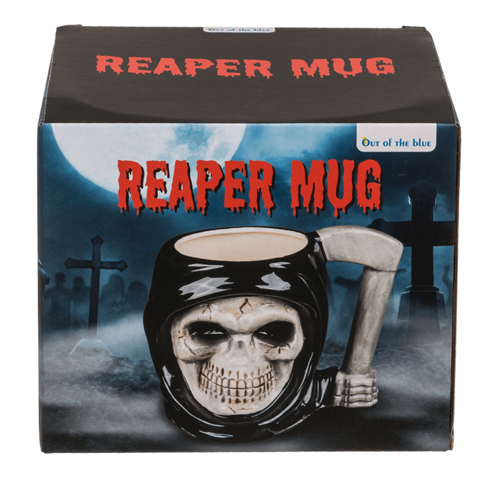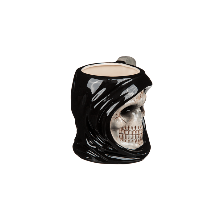 Mugg i stengods med motiv av en Reaper (dödsskördare). Storlek ca 16,5 x 11 cm. Passar utmärkt för halloween, temafester eller som en stämningsfull samlarmugg.