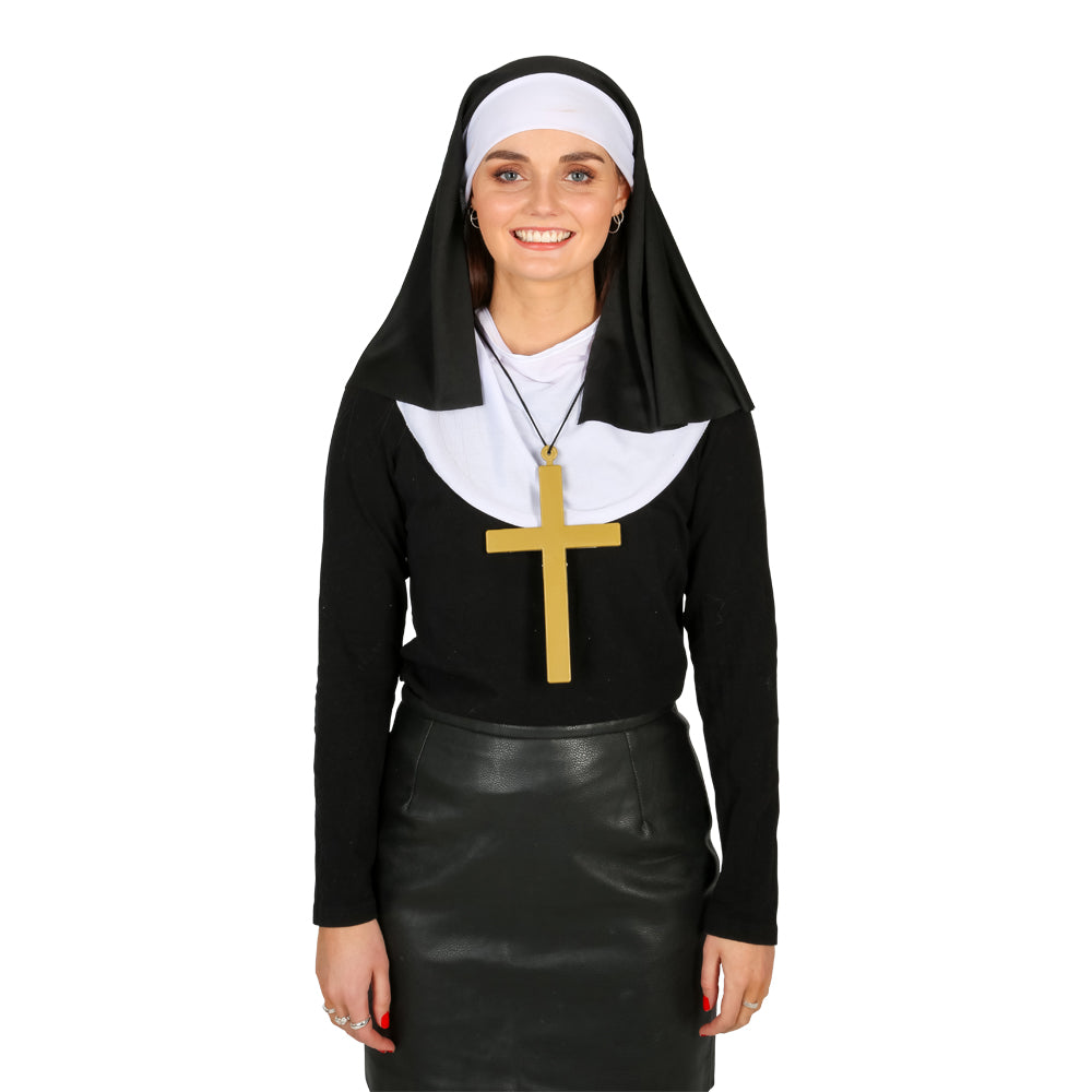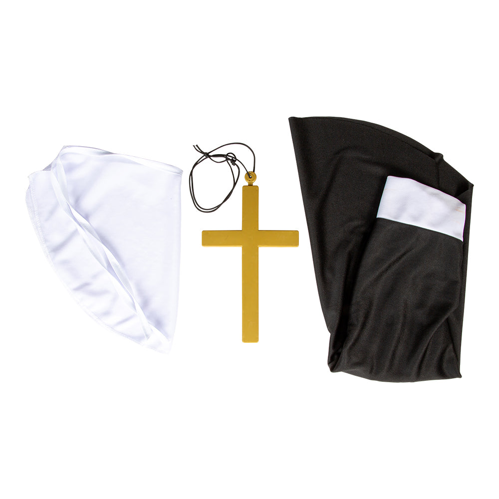 Kostymkit för nunneutklädnad! Innehåller dok, krage och kors. Perfekt till maskerad, temafest eller Halloween.
