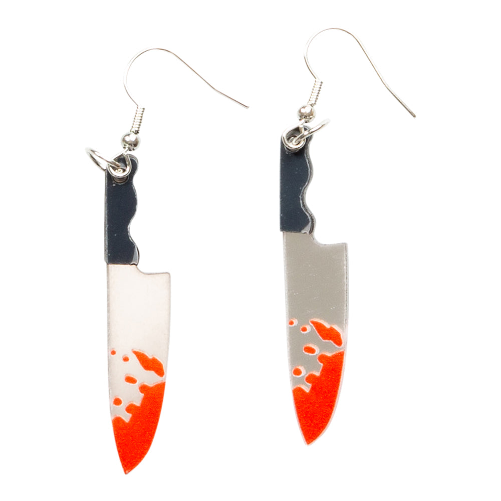 Örhängen i form av blodiga knivar. En skrämmande och effektfull accessoar, perfekt för halloween eller temafest med skräcktema.