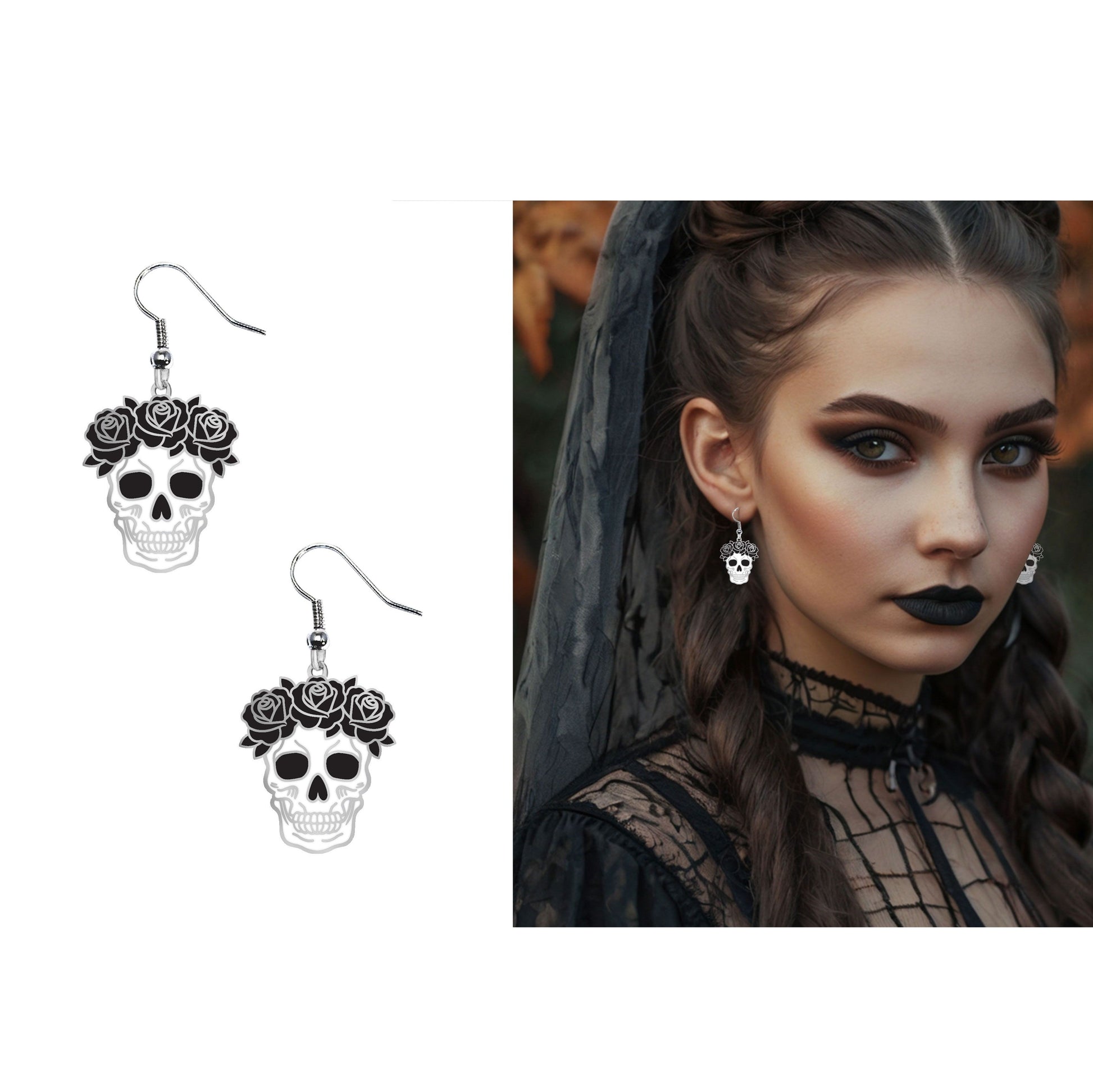 Stilfulla örhängen formade som dödskallar med en krans av svarta rosor – en perfekt accessoar för att sätta halloweenkänslan på din outfit. Enkla men effektfulla, och lika fina till fest som till vardags för den som älskar spooky detaljer.