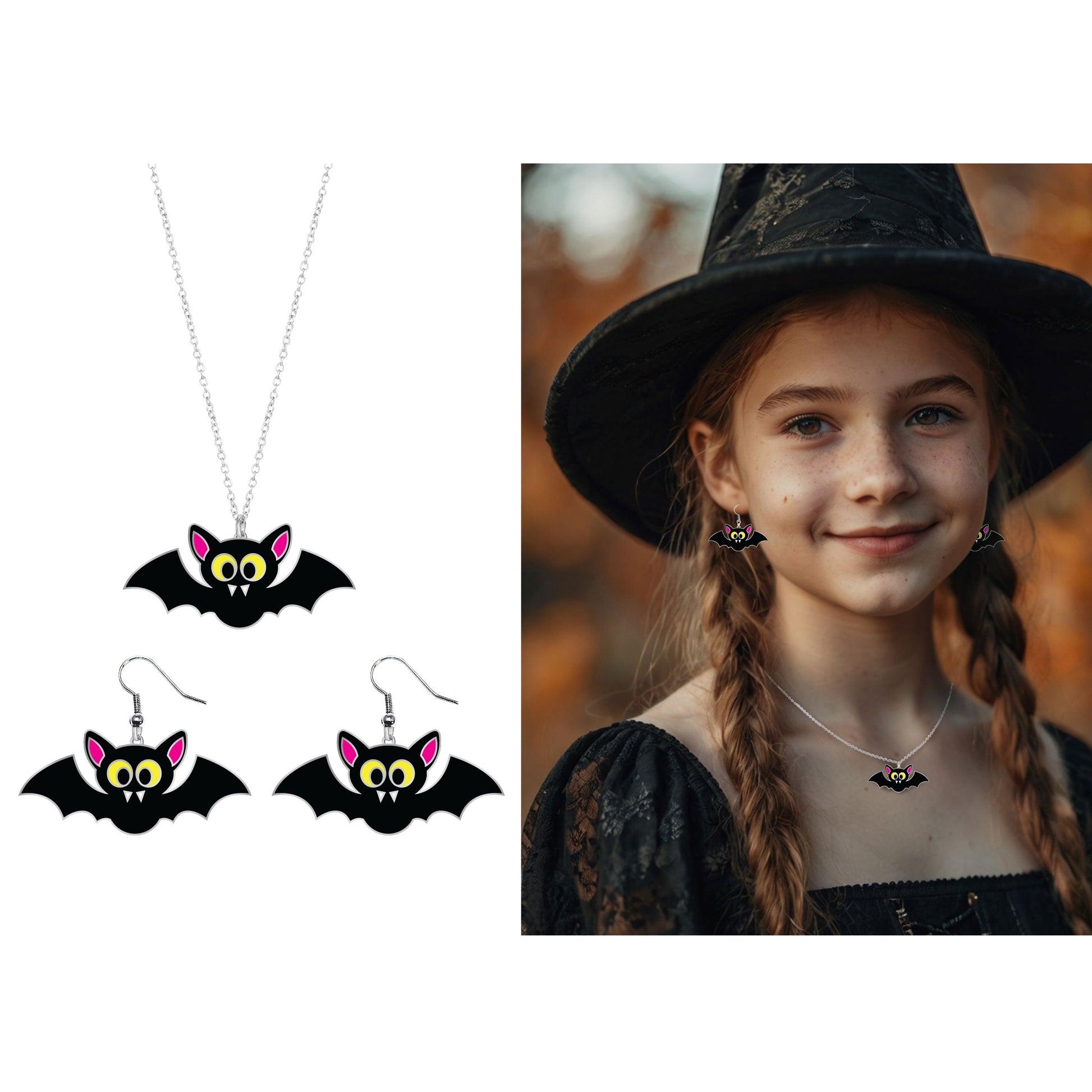 Ett charmigt smyckeset med både halsband och örhängen, prydda med söta små fladdermöss. Perfekt som halloweenaccessoar eller för dig som vill bära något lekfullt och spooky året runt.