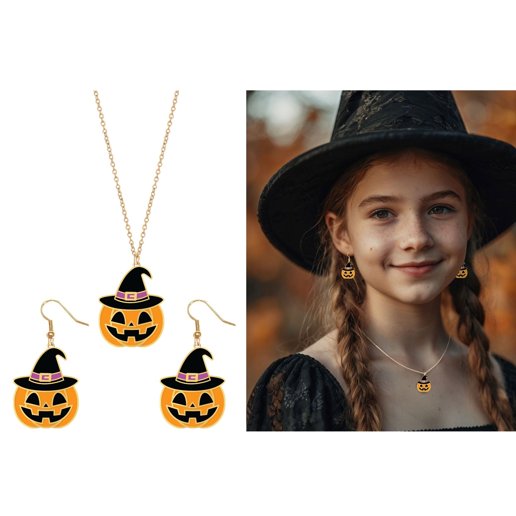 Ett lekfullt smyckeset med både örhängen och halsband, där pumporna är pyntade med små häxhattar. Perfekt som accessoar till halloweenoutfiten eller som en rolig present till någon som älskar högtiden.