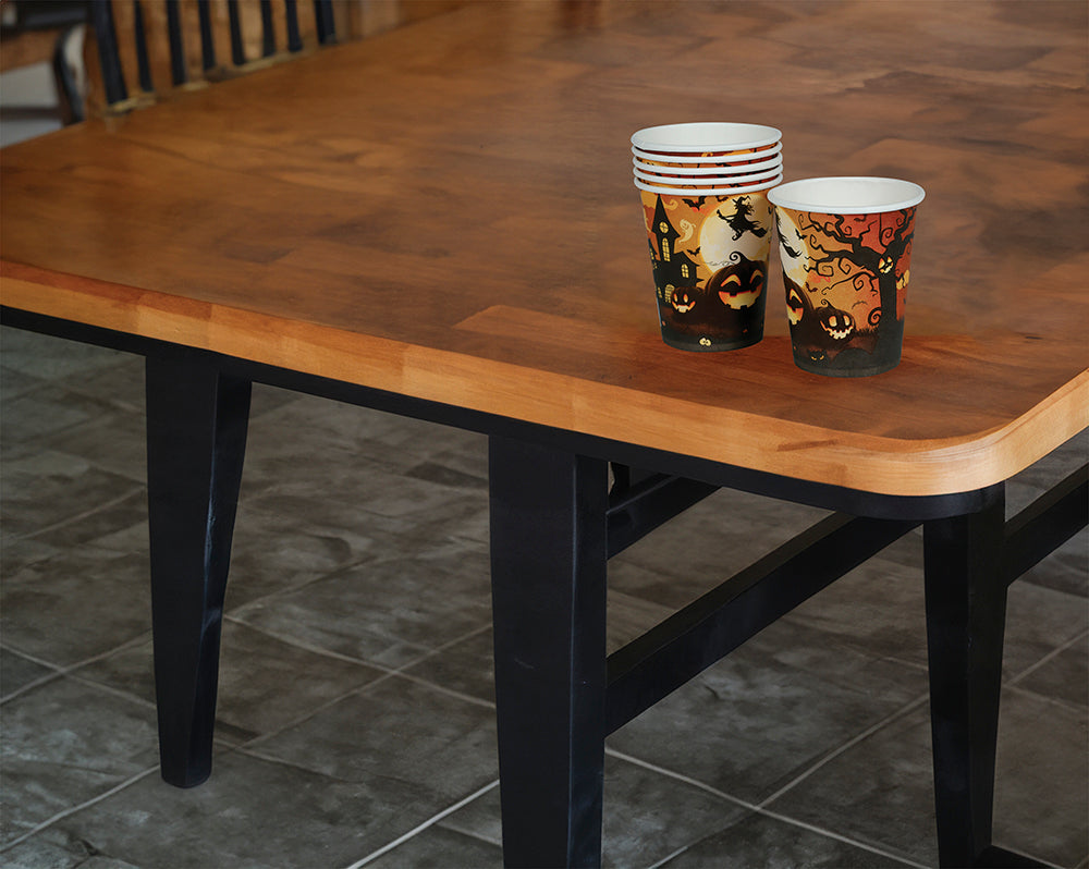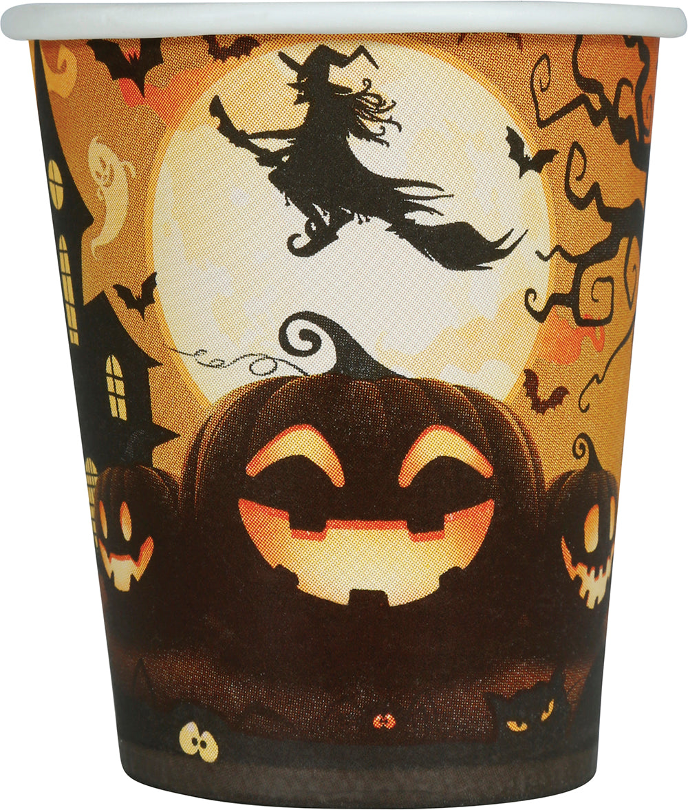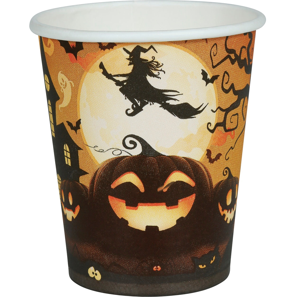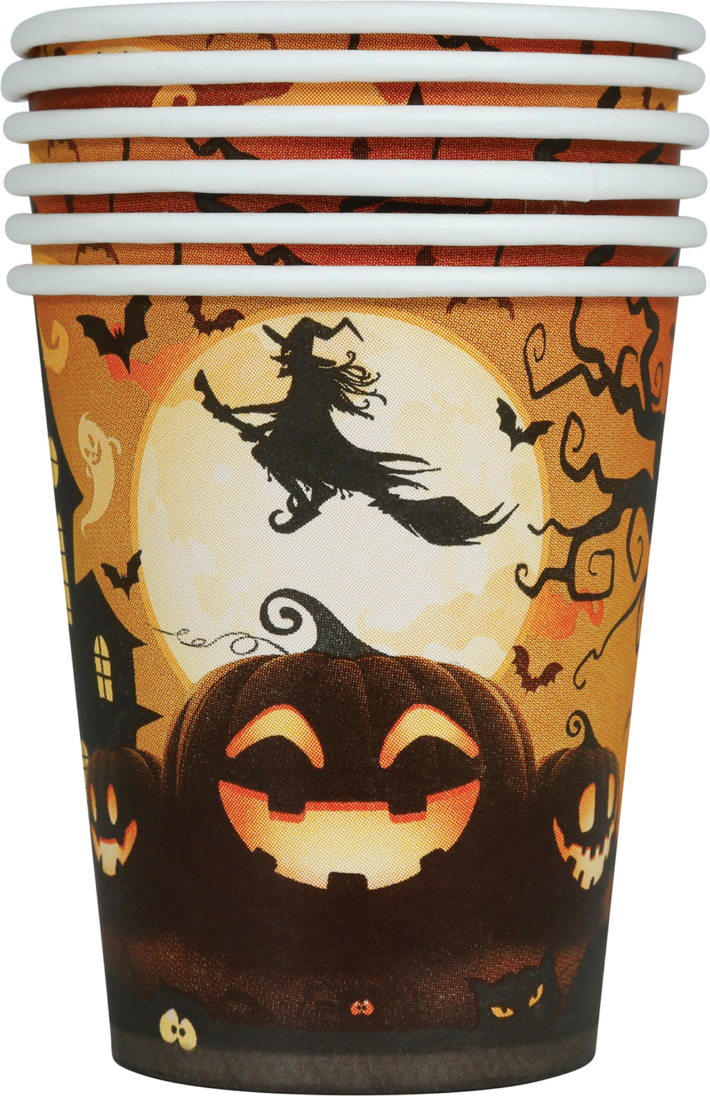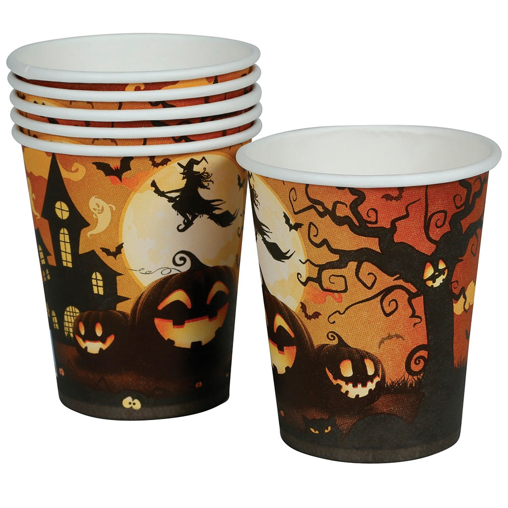 Förpackning med 6 pappersmuggar dekorerade med pumpor – perfekt till Halloweenfesten. Varje mugg rymmer 240 ml och är 9 cm hög.